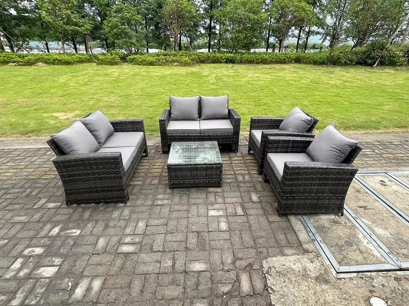 6 Places Gris foncé Ensemble de canapés en rotin à haut dossier ave Table basse carrée ave Canapé