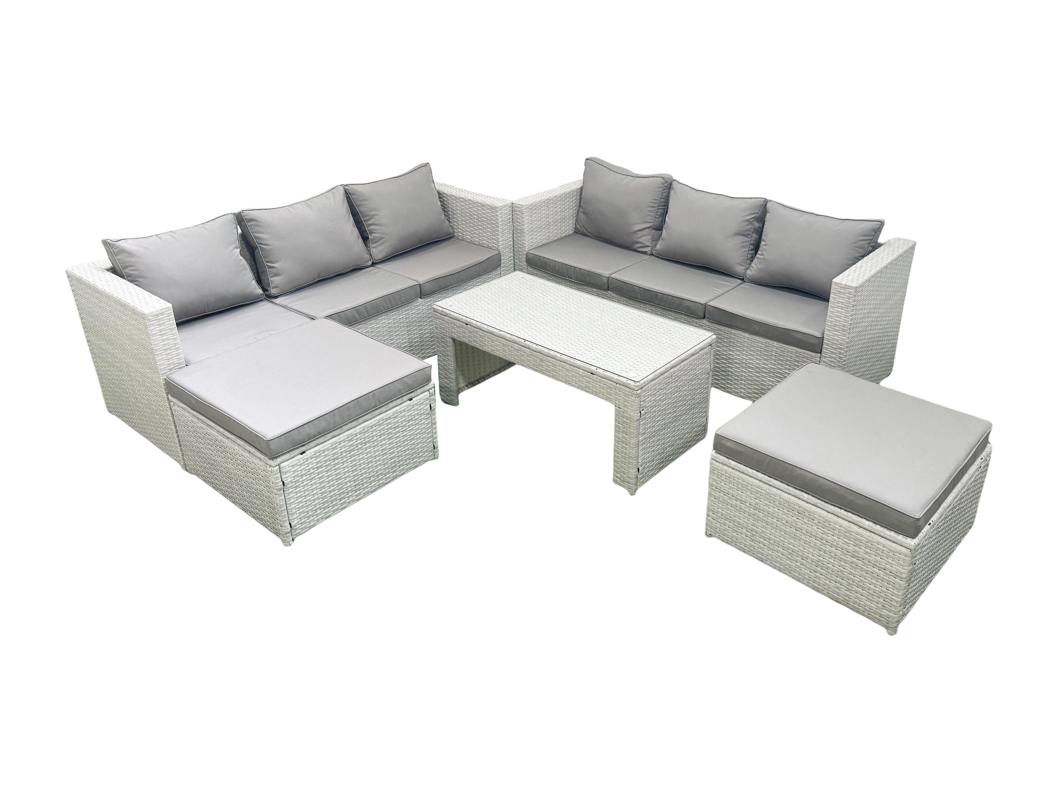 8 places Salon de Jardin Extérieur Canapé de jardin en rotin Table basse oblongue avec 2 Grand tabourets Gris clair mixte
