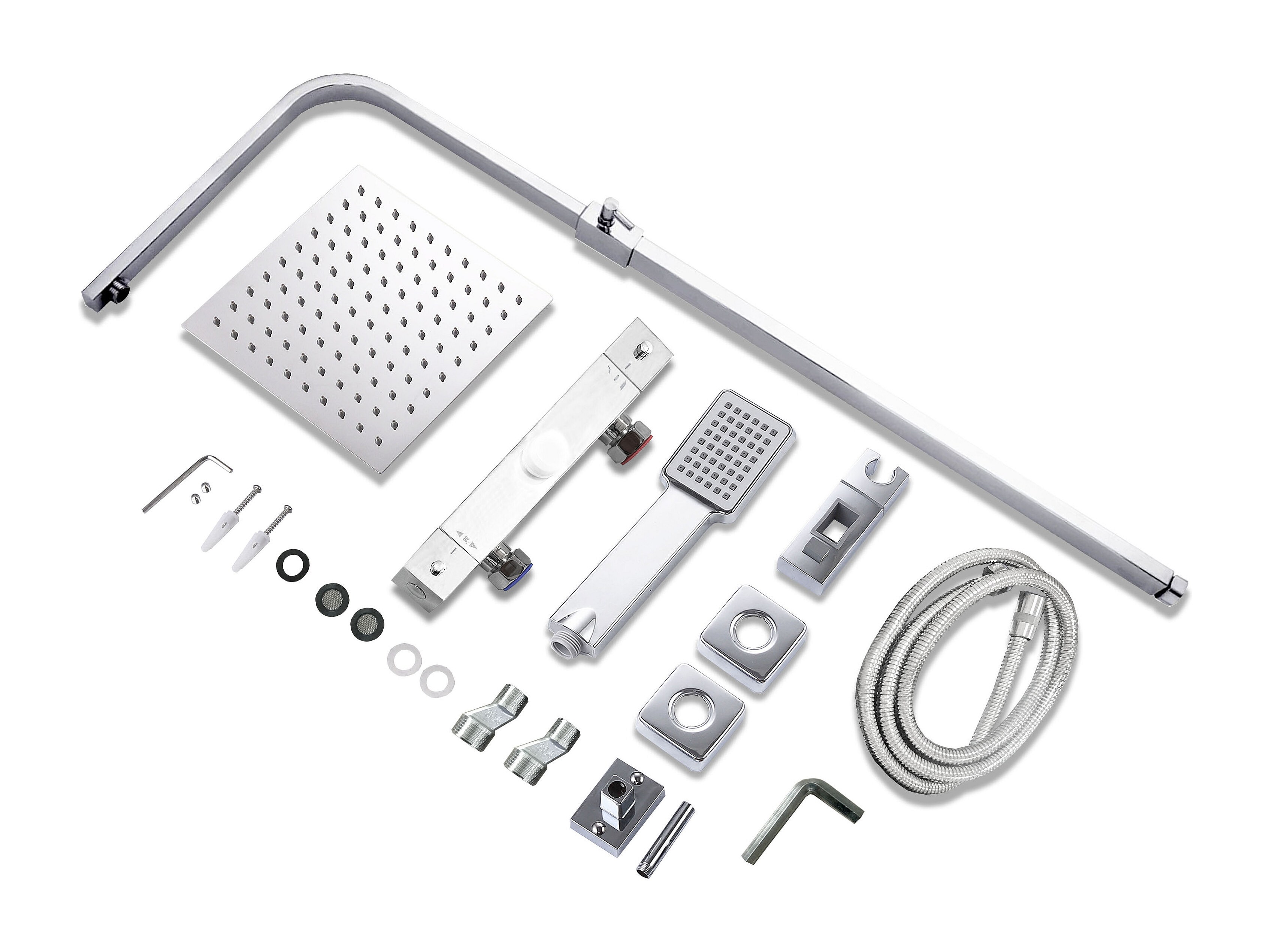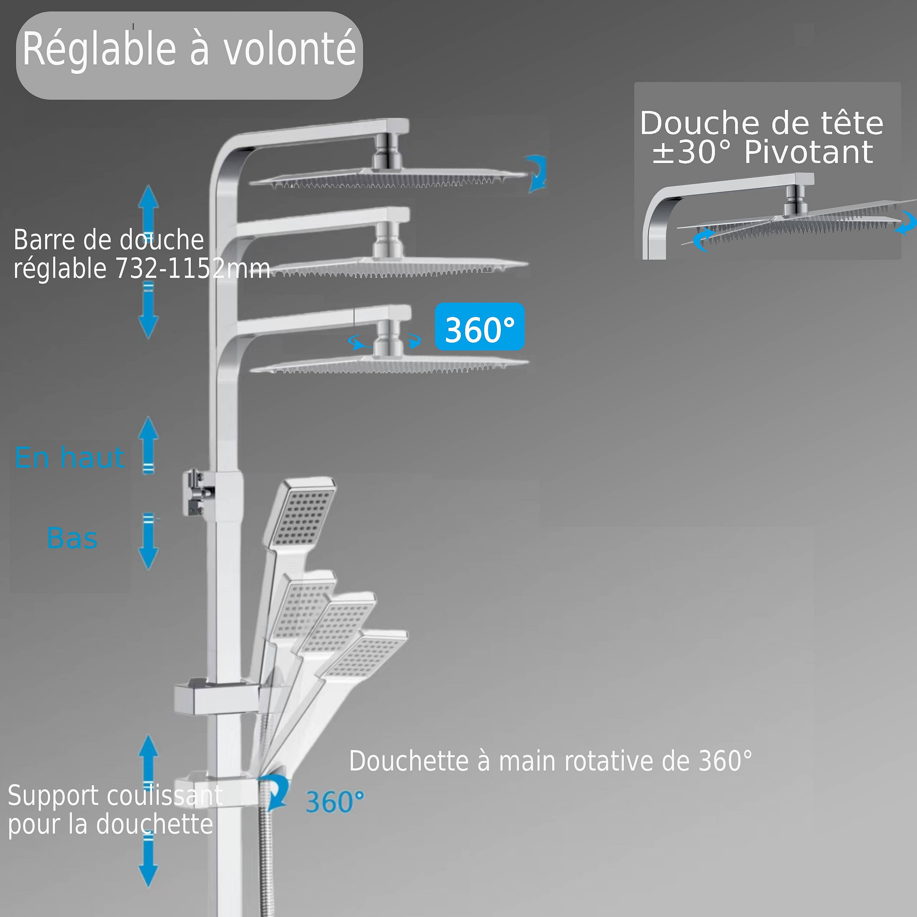 AICA colonne de douche en acier inoxydable avec douche de tête carrée 250 mm, douchette 3 fonctions, hauteur réglable
