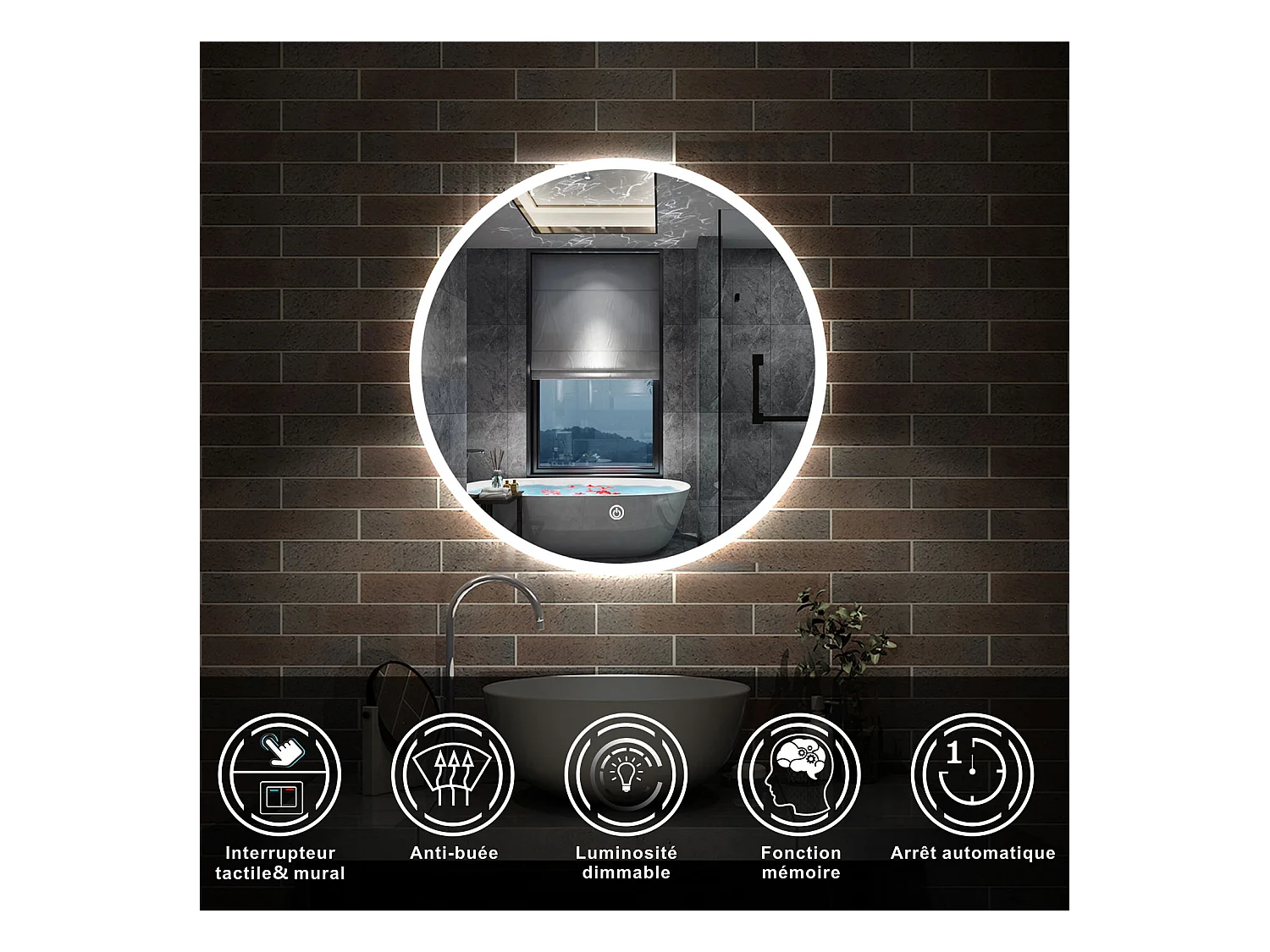 AICA Ensemble meuble de salle de bain Vasque L.50cm 2 tiroirs + lavabo + LED Miroir Rond 60cm + Colonne, Chêne