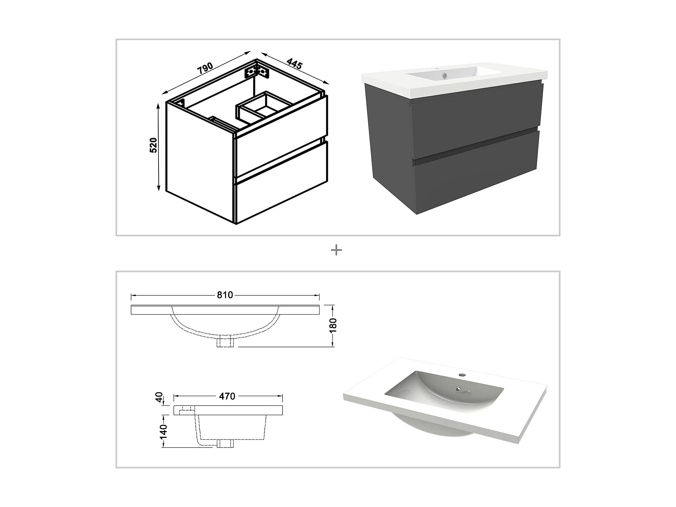 AICA Meuble Salle de Bain 80cm Anthracite vasque + colonne + miroir 3 couleurs LED