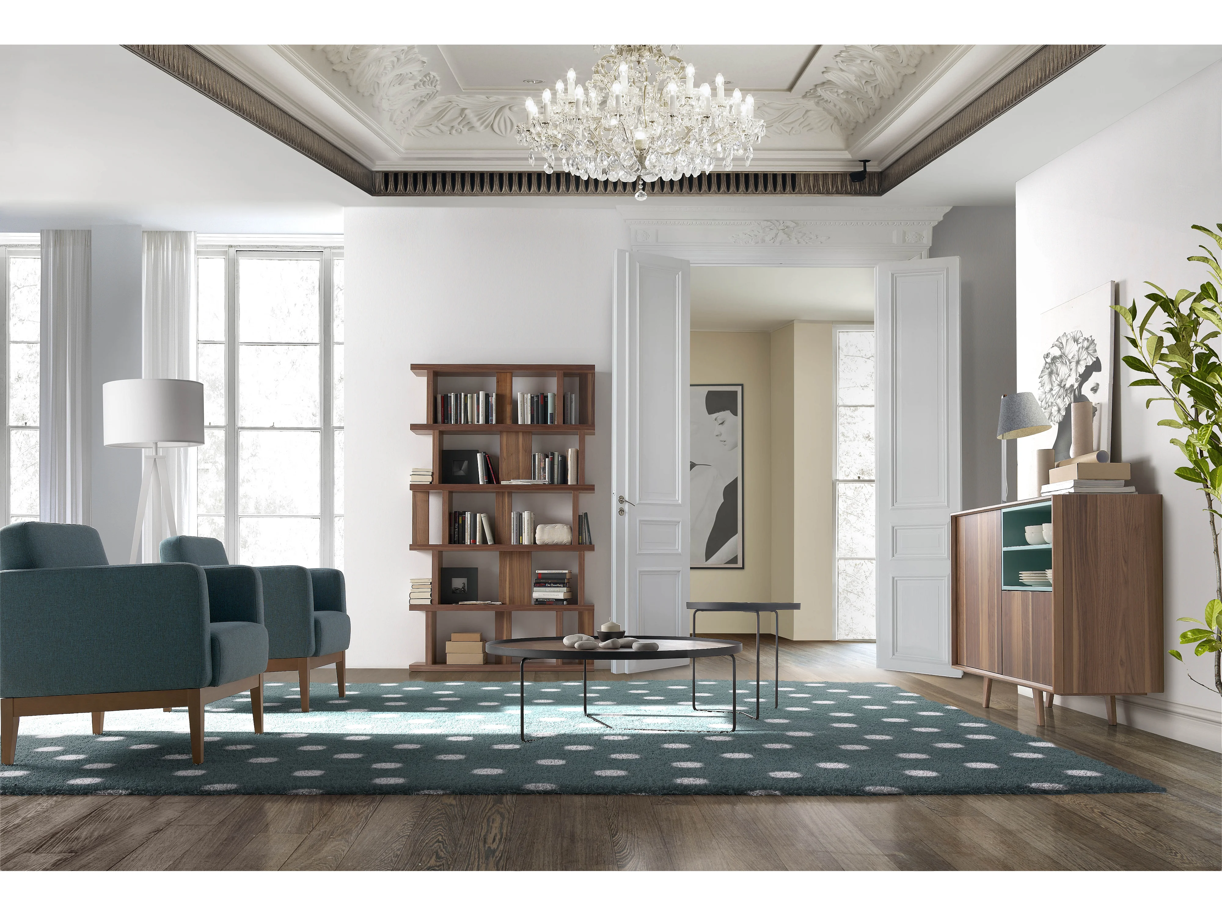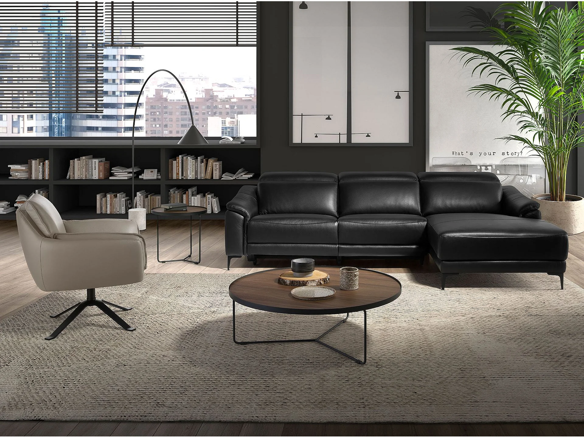 Table basse ronde bois plaqué noyer et métal noir Noka