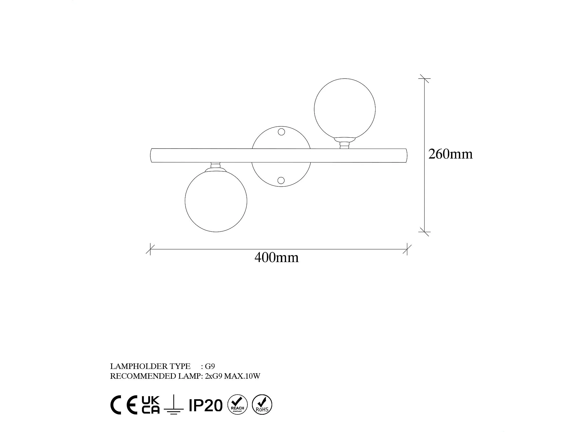 Applique murale art déco dorée, 2 globes blancs L 40 cm SIERRE