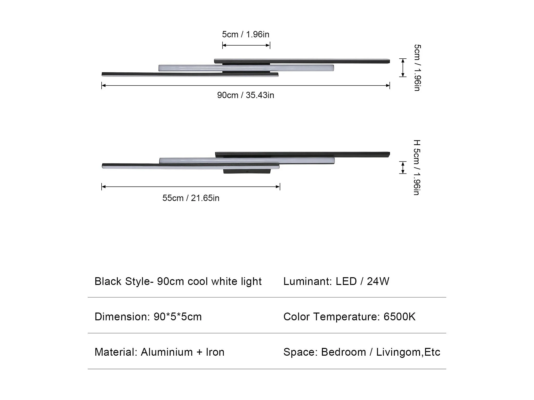 Applique murale LED noire 24 W 2700 lm, applique murale LED d'intérieur moderne 90 cm, éclairage mural blanc chaud 3000 K pour chambre, couloir