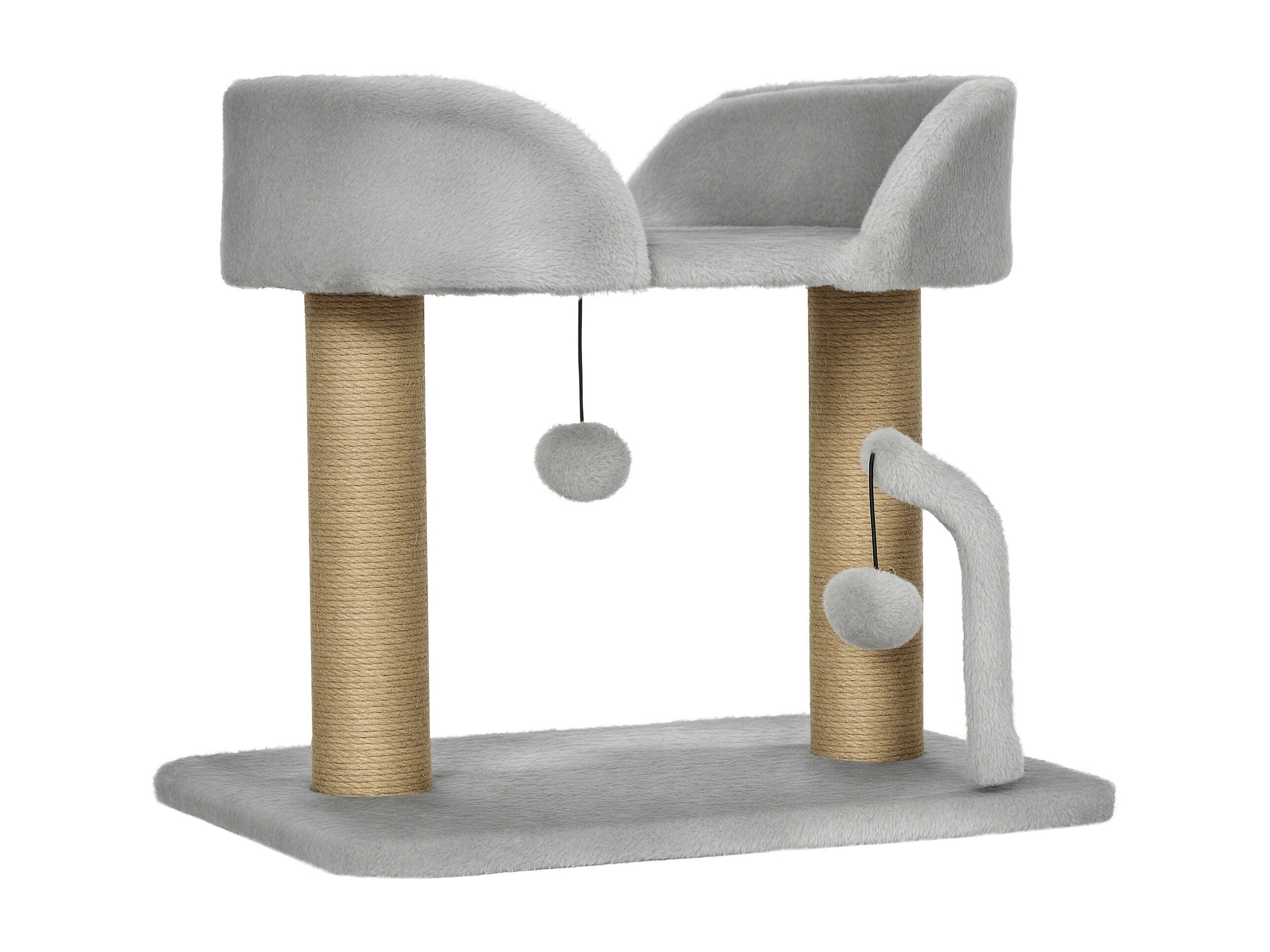 Arbre à chat 2 griffoirs jute naturelle panier jeu 2 boules suspendues avec clochettes peluche grise