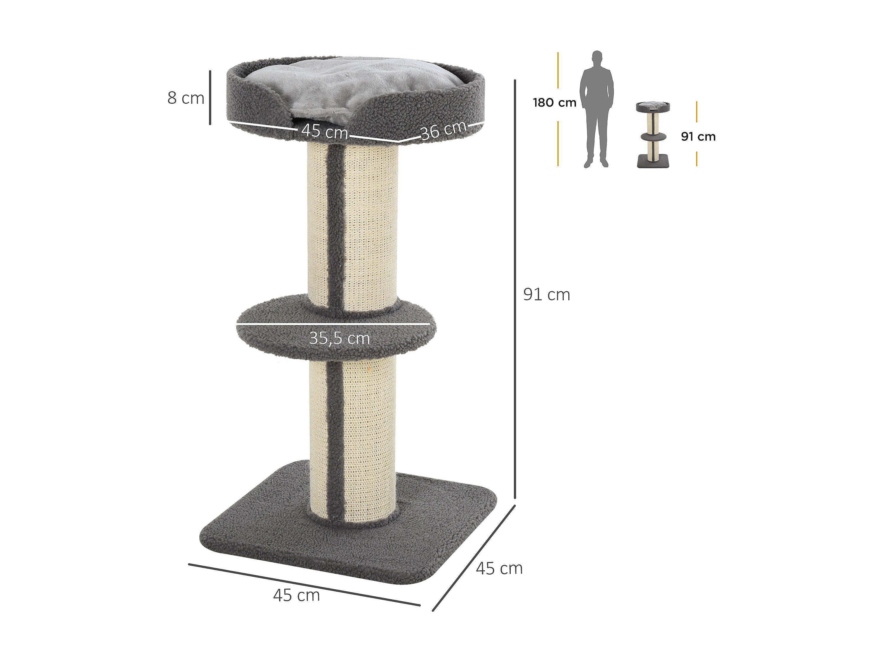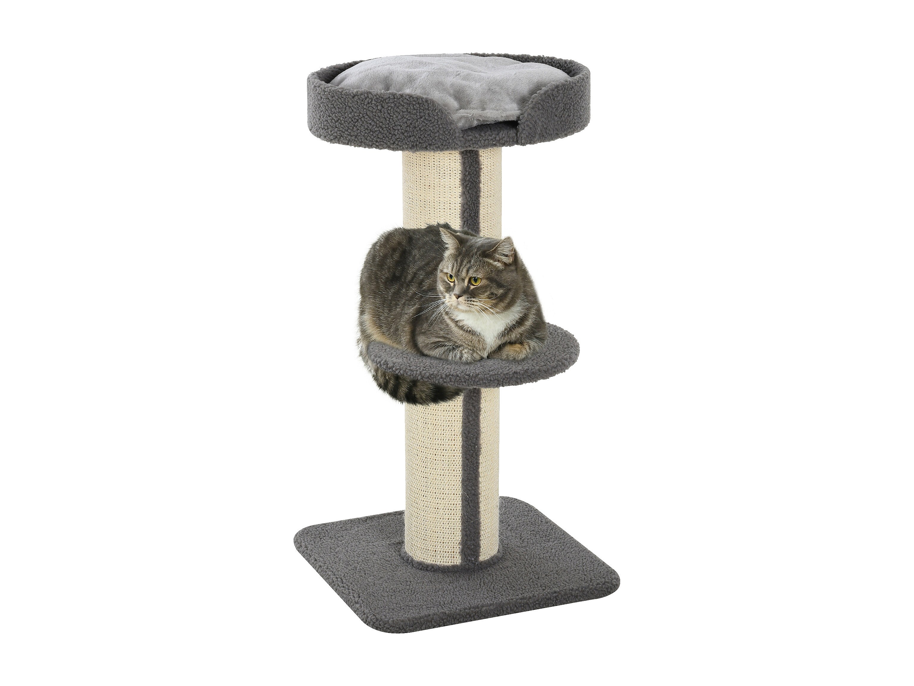 Arbre à chat griffoir grattoir design jeu boule suspendue 2 plateformes peluche sisal naturel gris