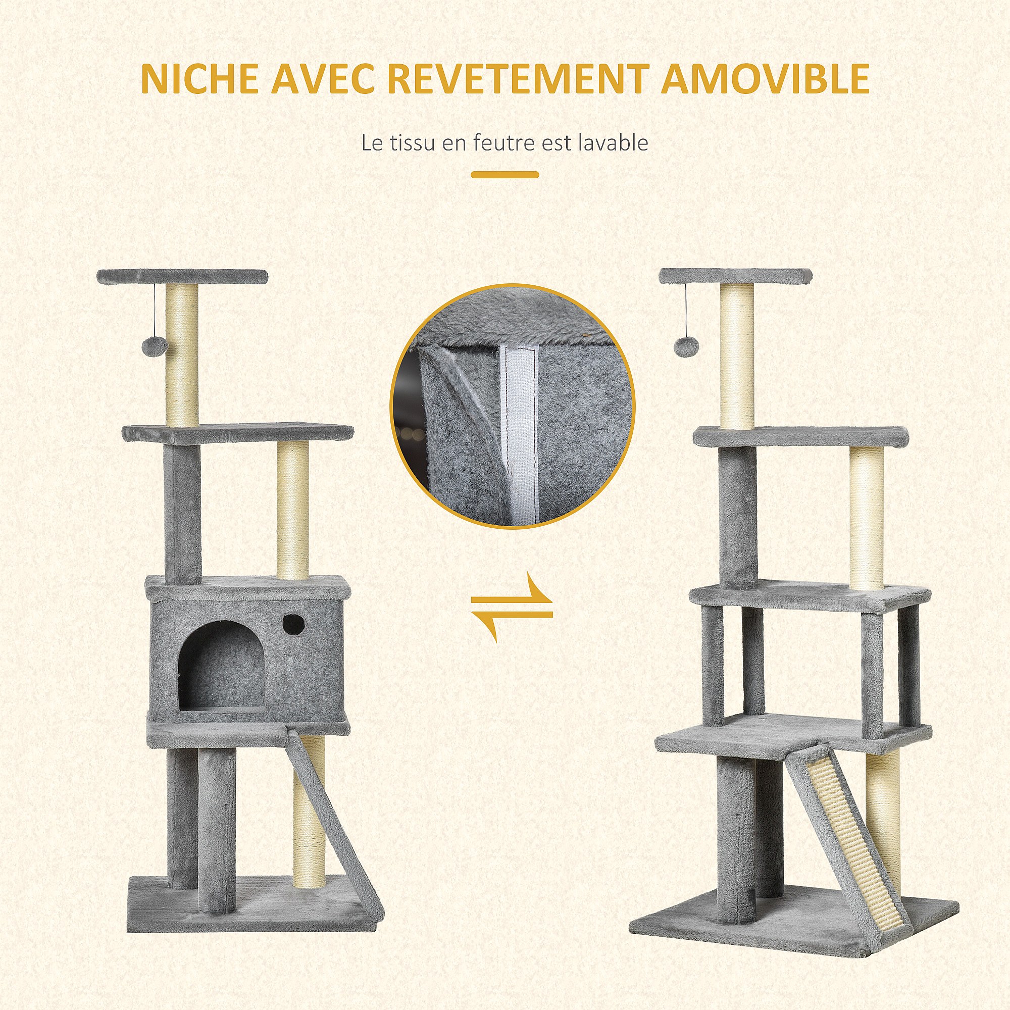 Arbre à chat centre d'activités multi-équipé griffoirs grattoir jeu boule suspendue niche housse amovible plateformes gris