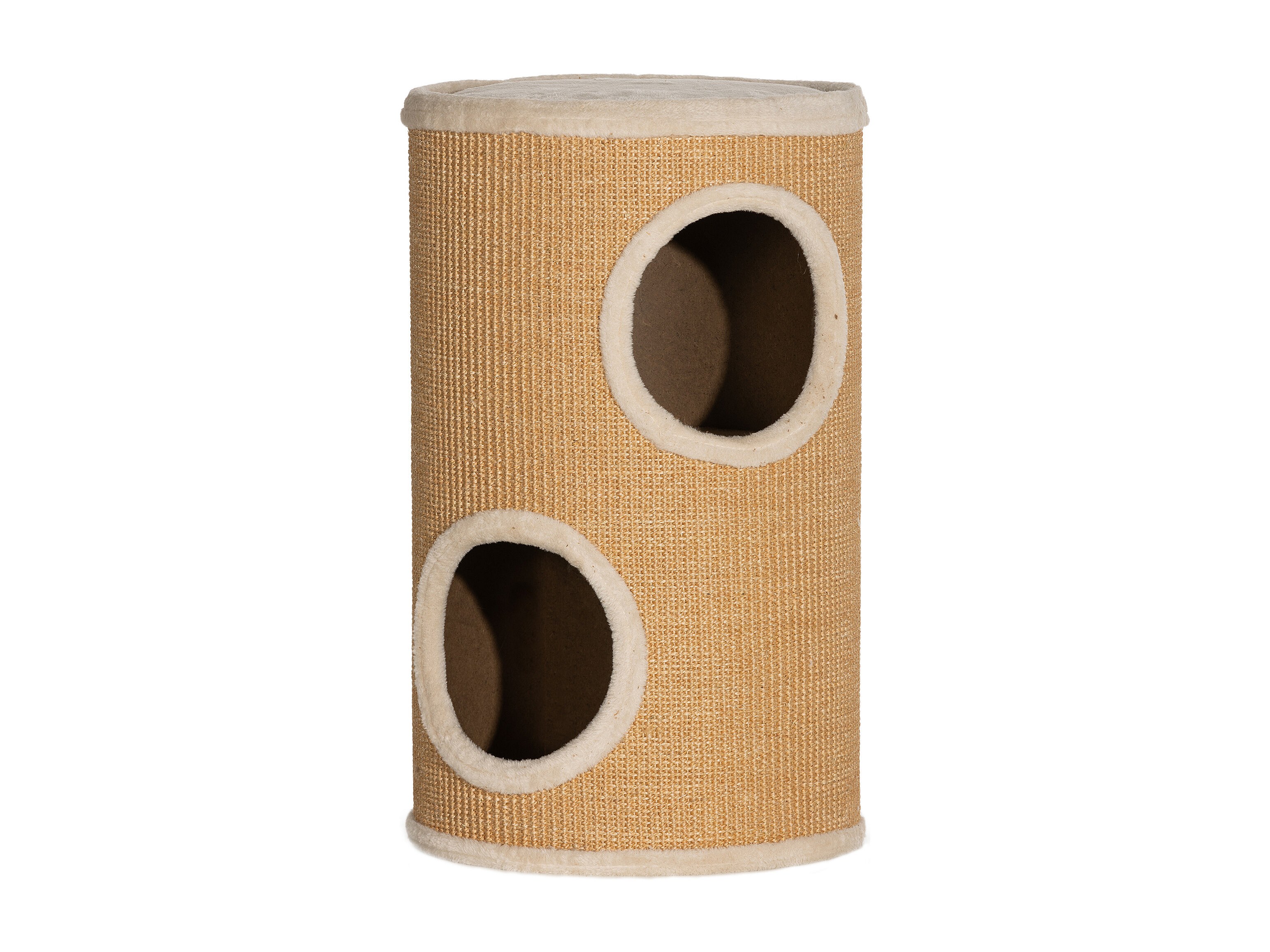Arbre à chat cylindrique - tour à griffer pour chat - tonneau griffoir - 2 niches + plateforme - sisal peluche beige