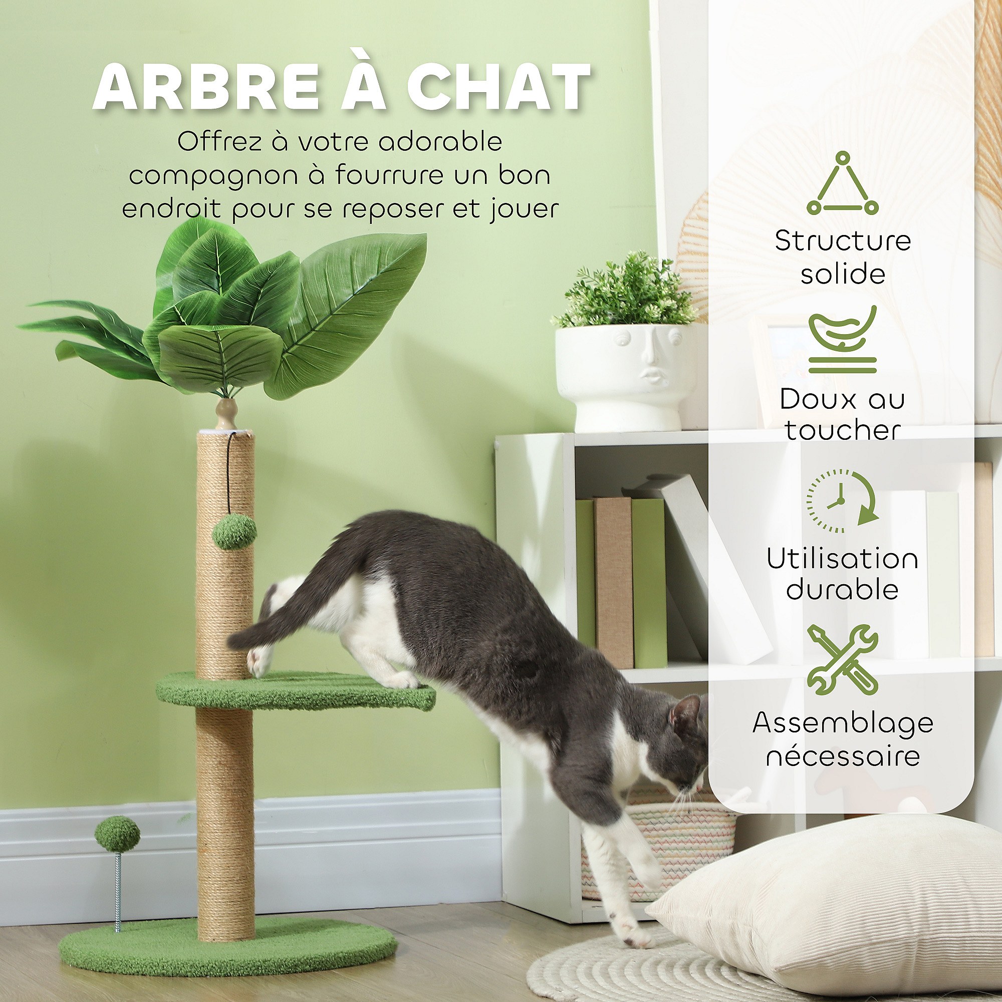 Arbre à chat design tropical - plateforme, griffoir, 2 jeux boules - beige vert
