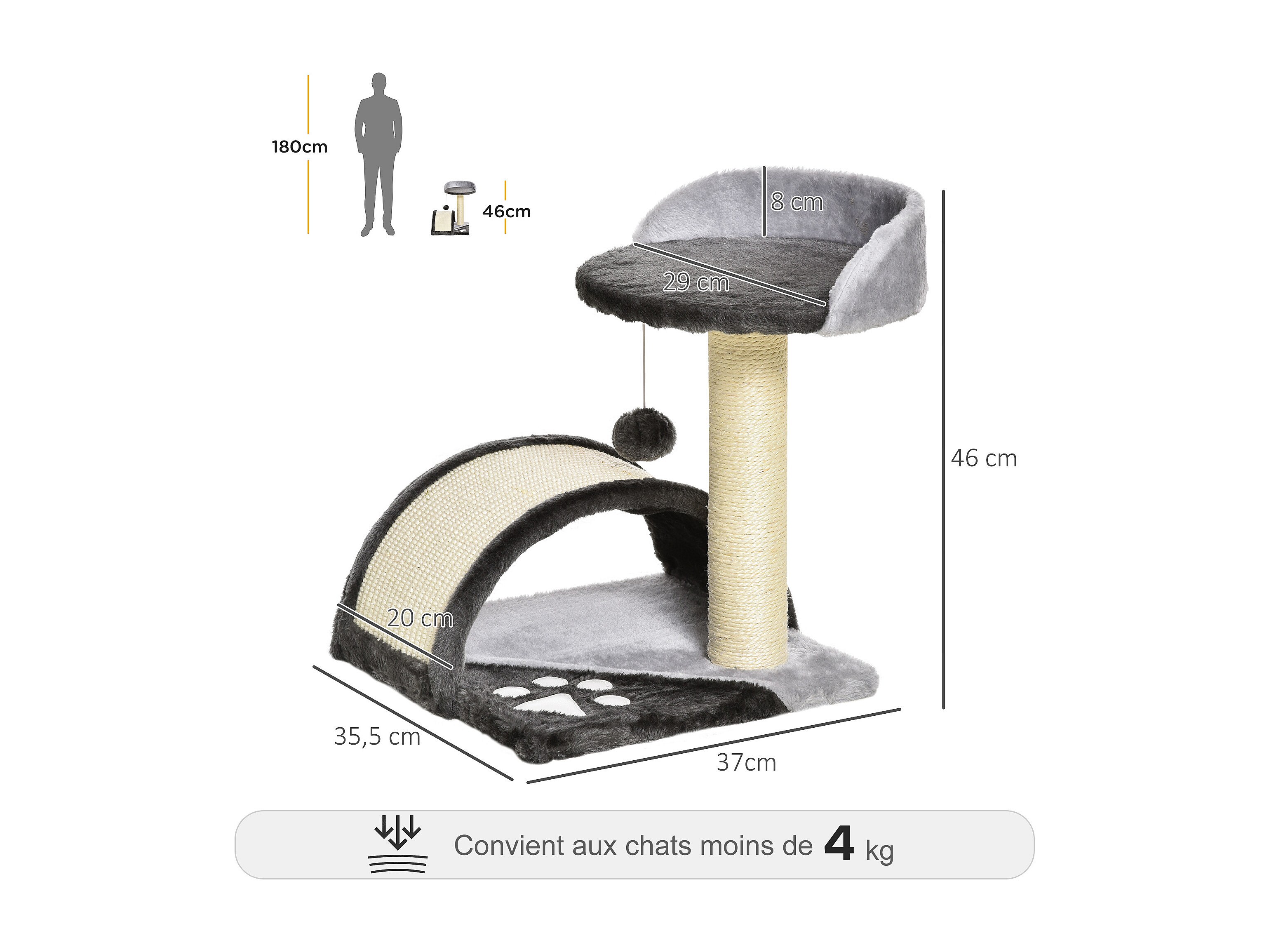Arbre à chat griffoir grattoir design jeu boule suspendue 2 plateformes peluche sisal naturel gris