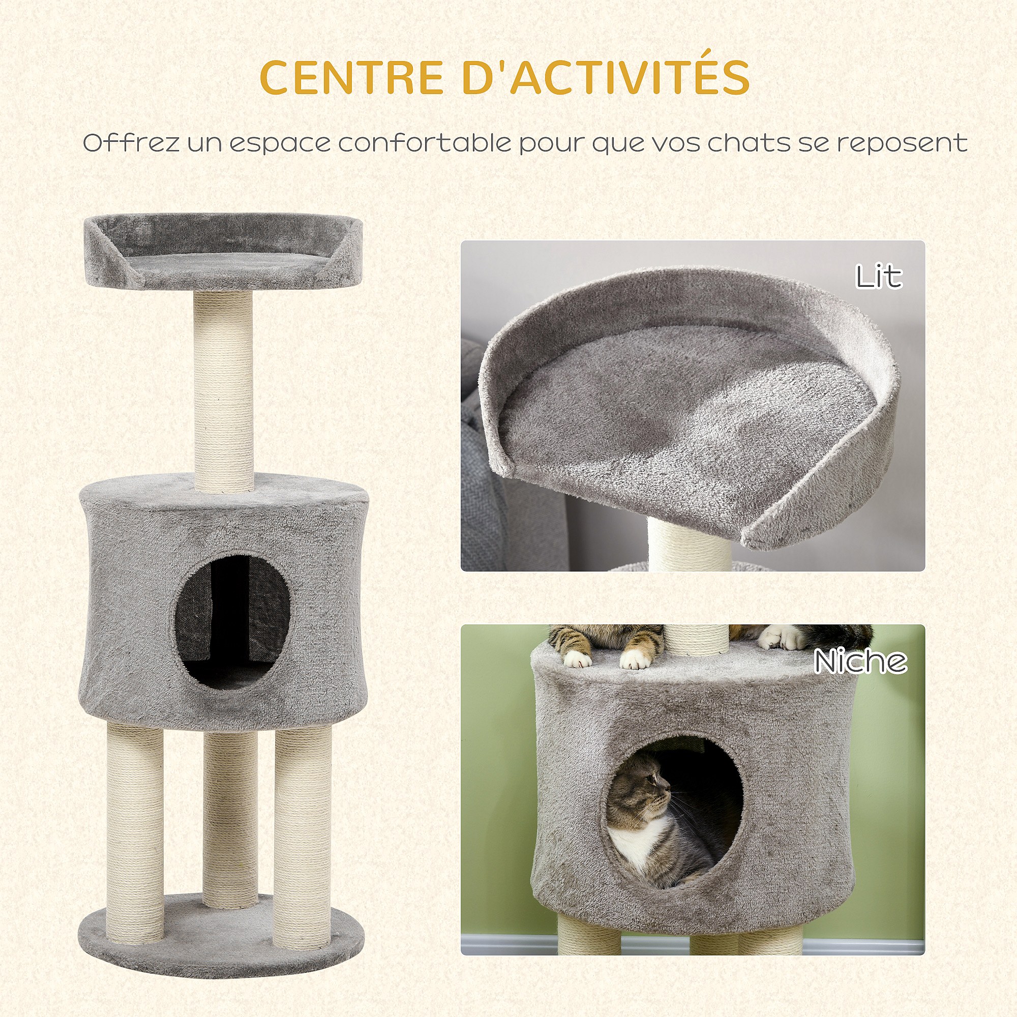 Arbre à chat griffoirs sisal naturel arbre à grimper H.103 cm niche plateforme d'observation peluche grise