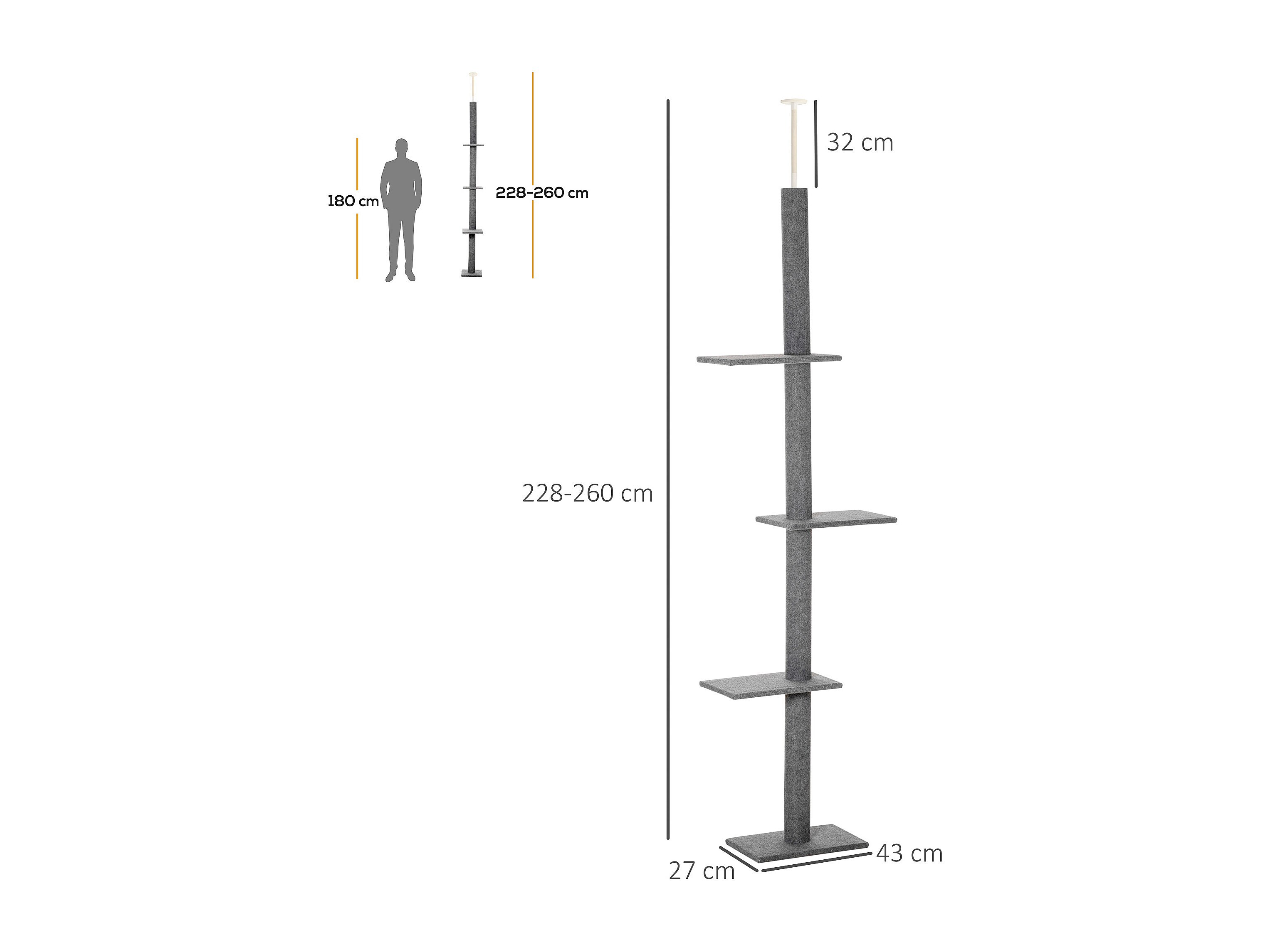 Arbre à chat poteau à griffer hauteur réglable dim. 43L x 27I x 228-260H cm 4 niveaux d'activités gris clair