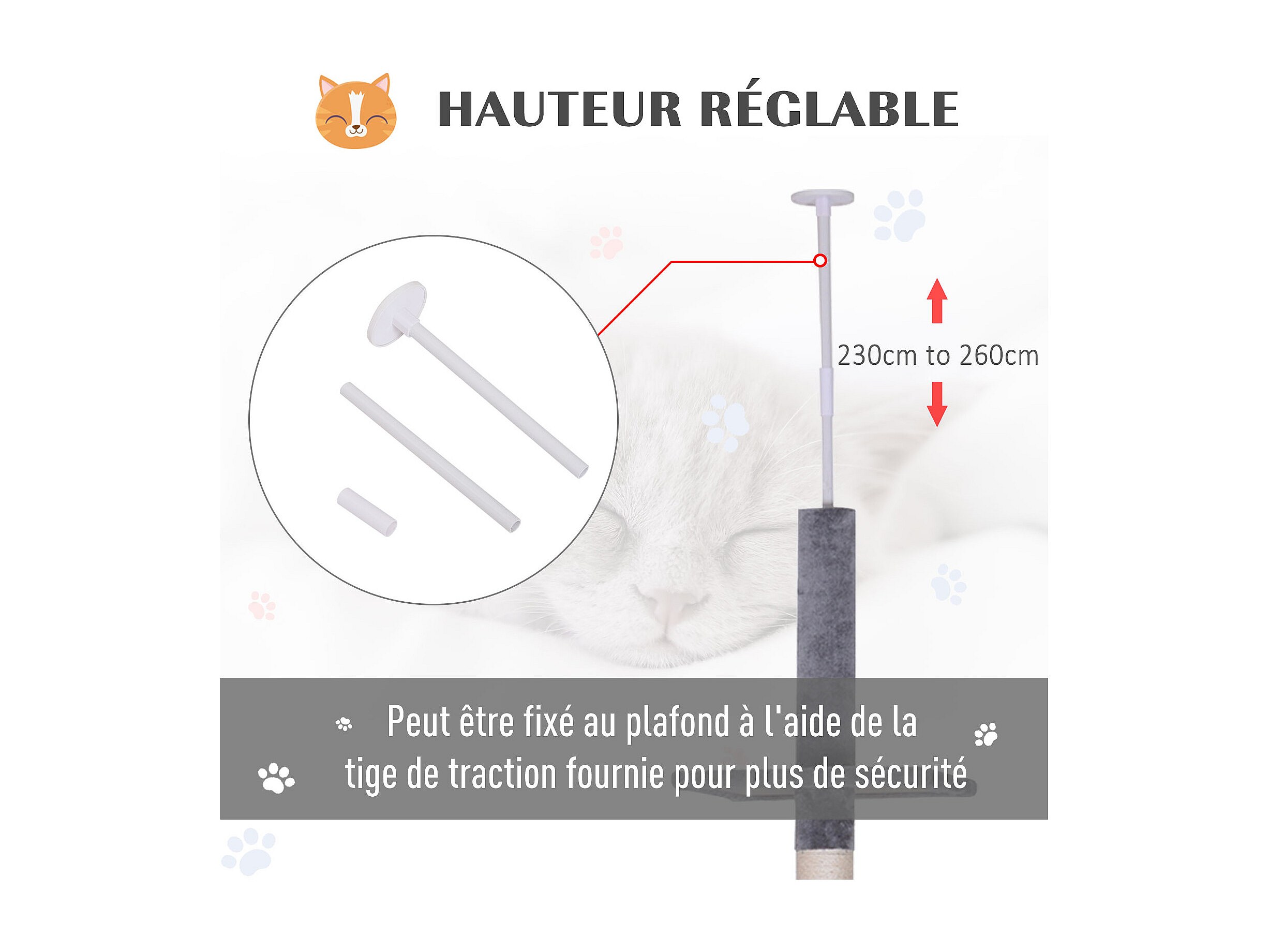 Arbre à chat poteau à griffer hauteur réglable dim. 43L x 27I x 228-260H cm 4 niveaux d'activités gris clair