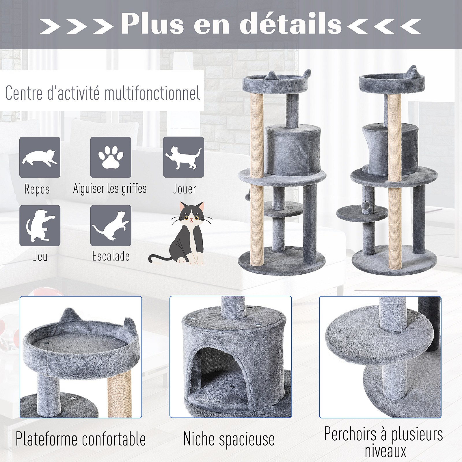 Arbre à chat griffoirs sisal naturel et massant grande niche plateforme panier jeu boule suspendue peluche gris