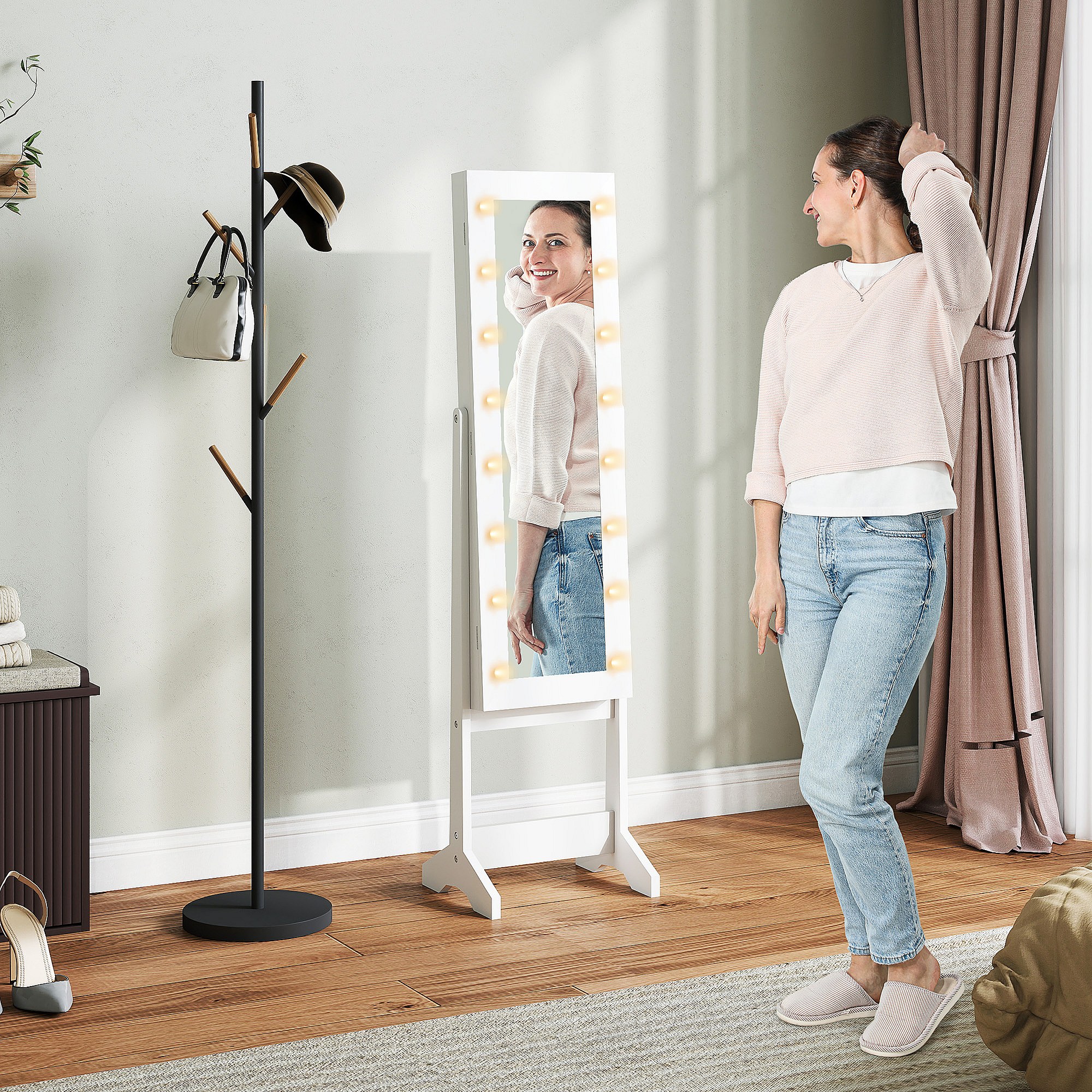 Armoire à bijoux sur pied avec miroir psyché coffre à bijoux, armoire de rangement cosmétiques