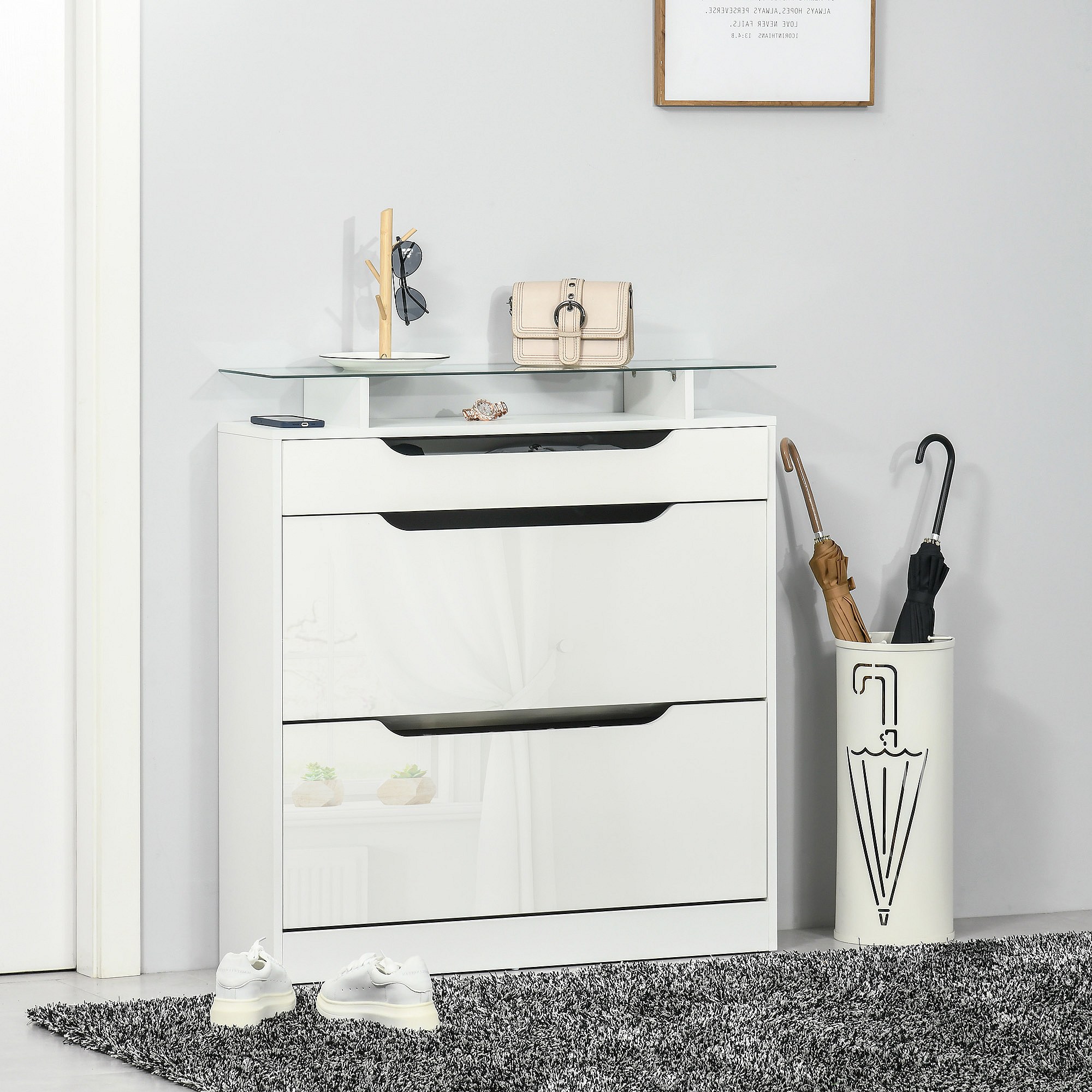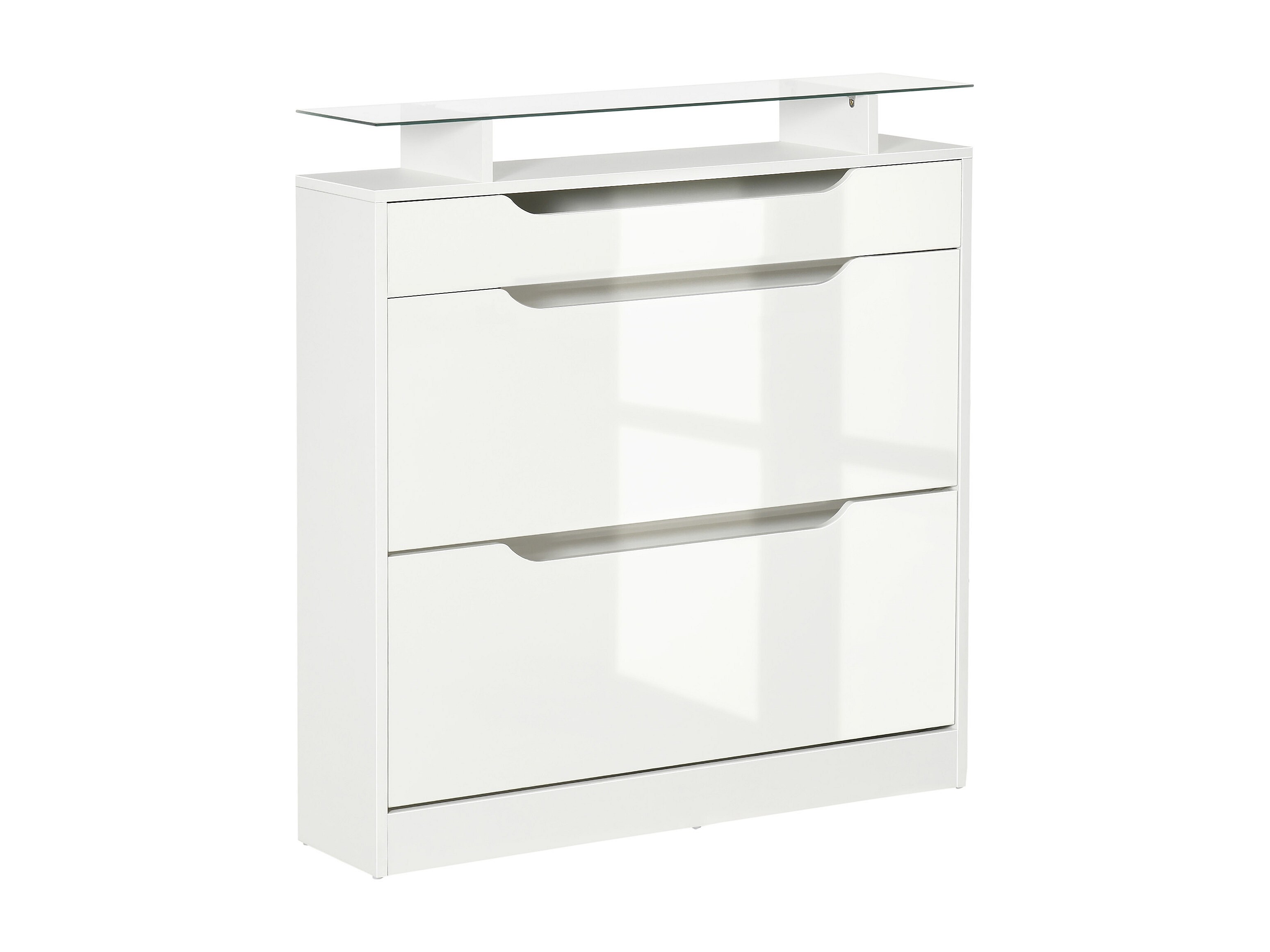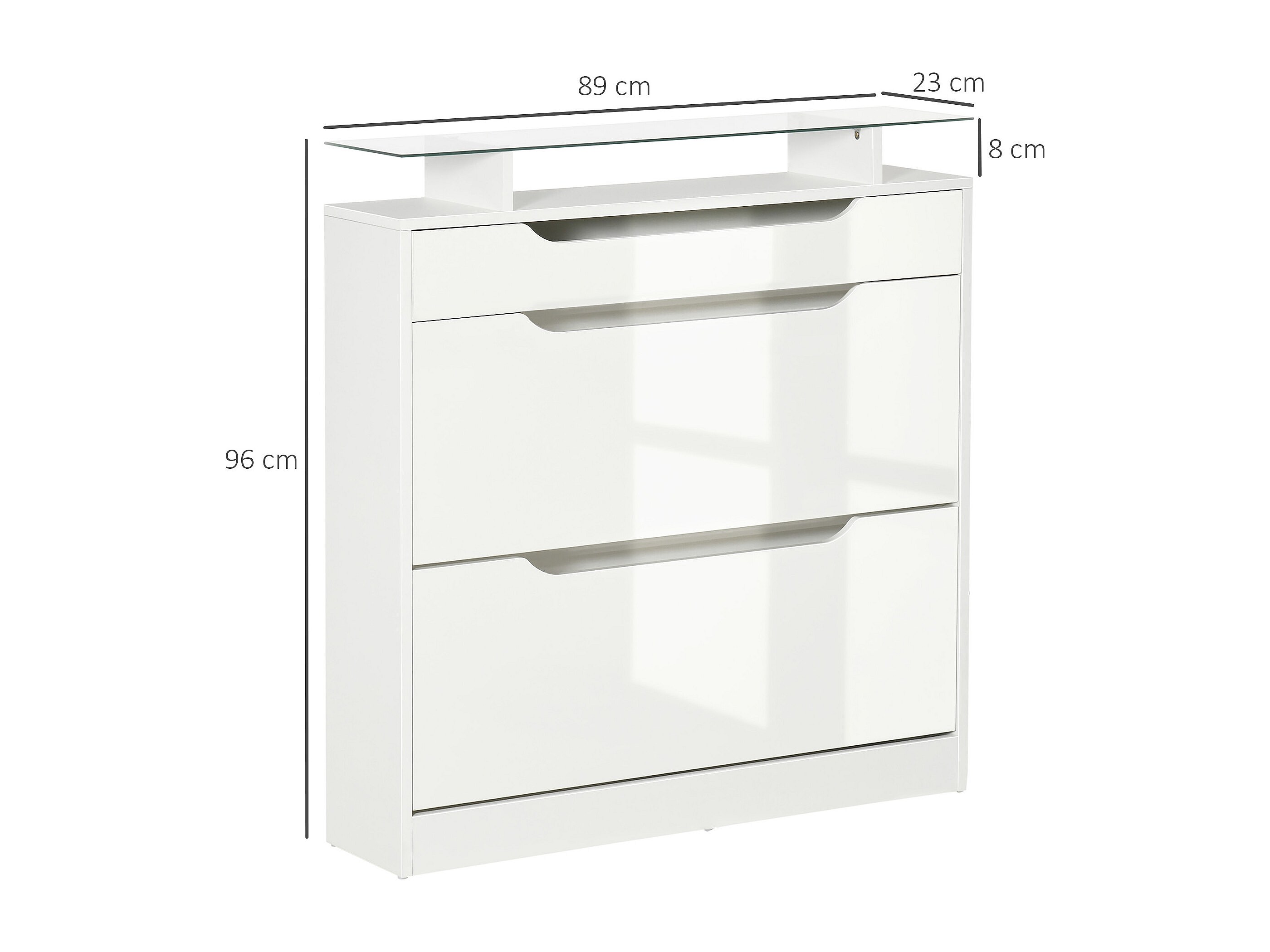 Armoire à chaussures avec 2 tiroirs rabattables + 1 tiroir coulissant + 1 comptoir et 1 plateau en verre étagère réglable sur 2 niveaux 89 x 23 x 96 cm blanc