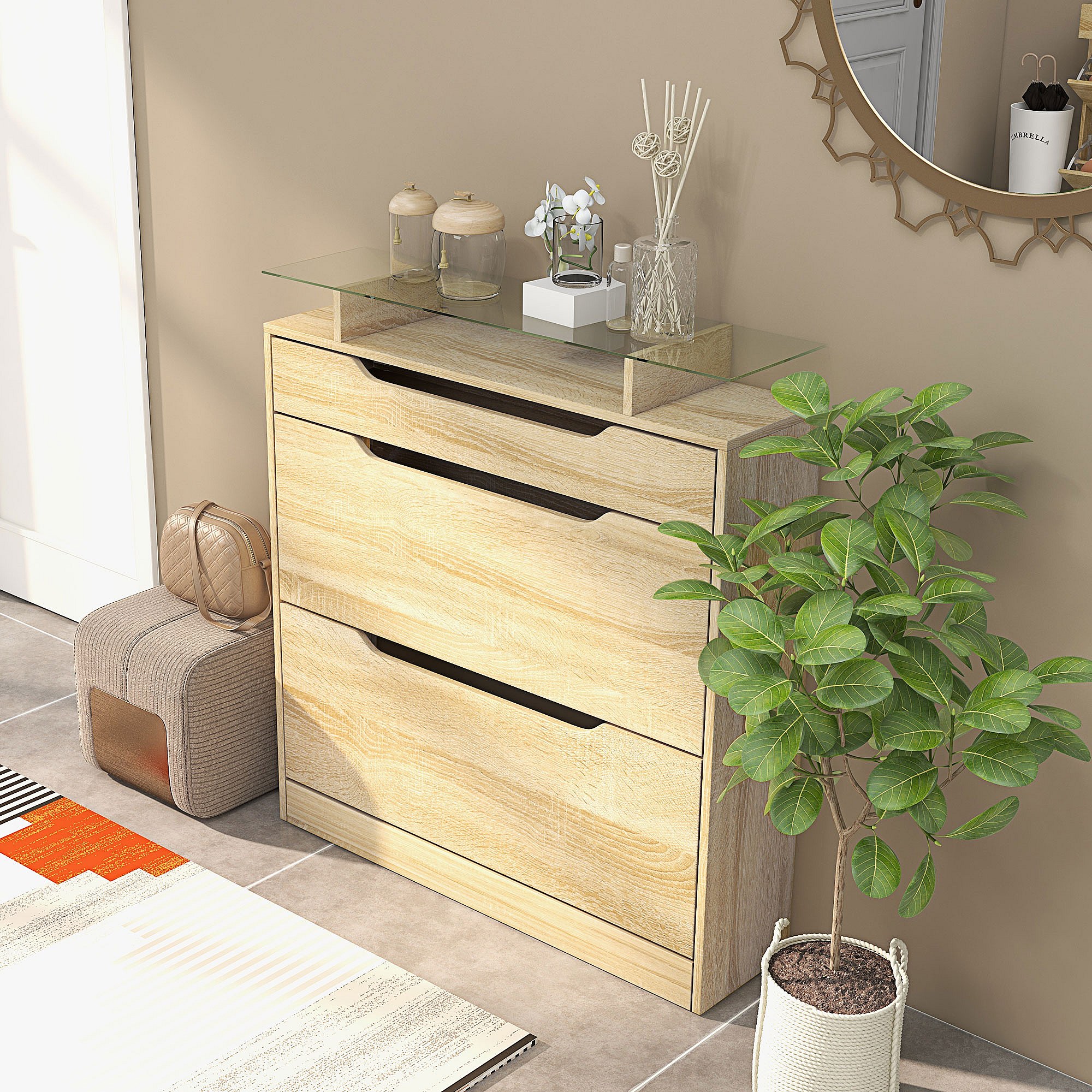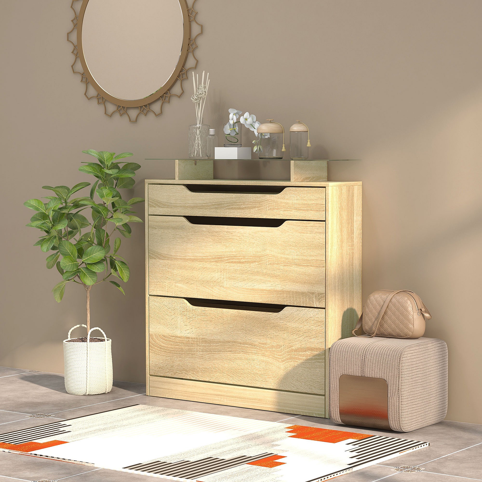 Armoire à chaussures avec 2 tiroirs rabattables + 1 tiroir coulissant + 1 comptoir et 1 plateau en verre étagère réglable sur 2 niveaux 89 x 23 x 96 cm effet bois
