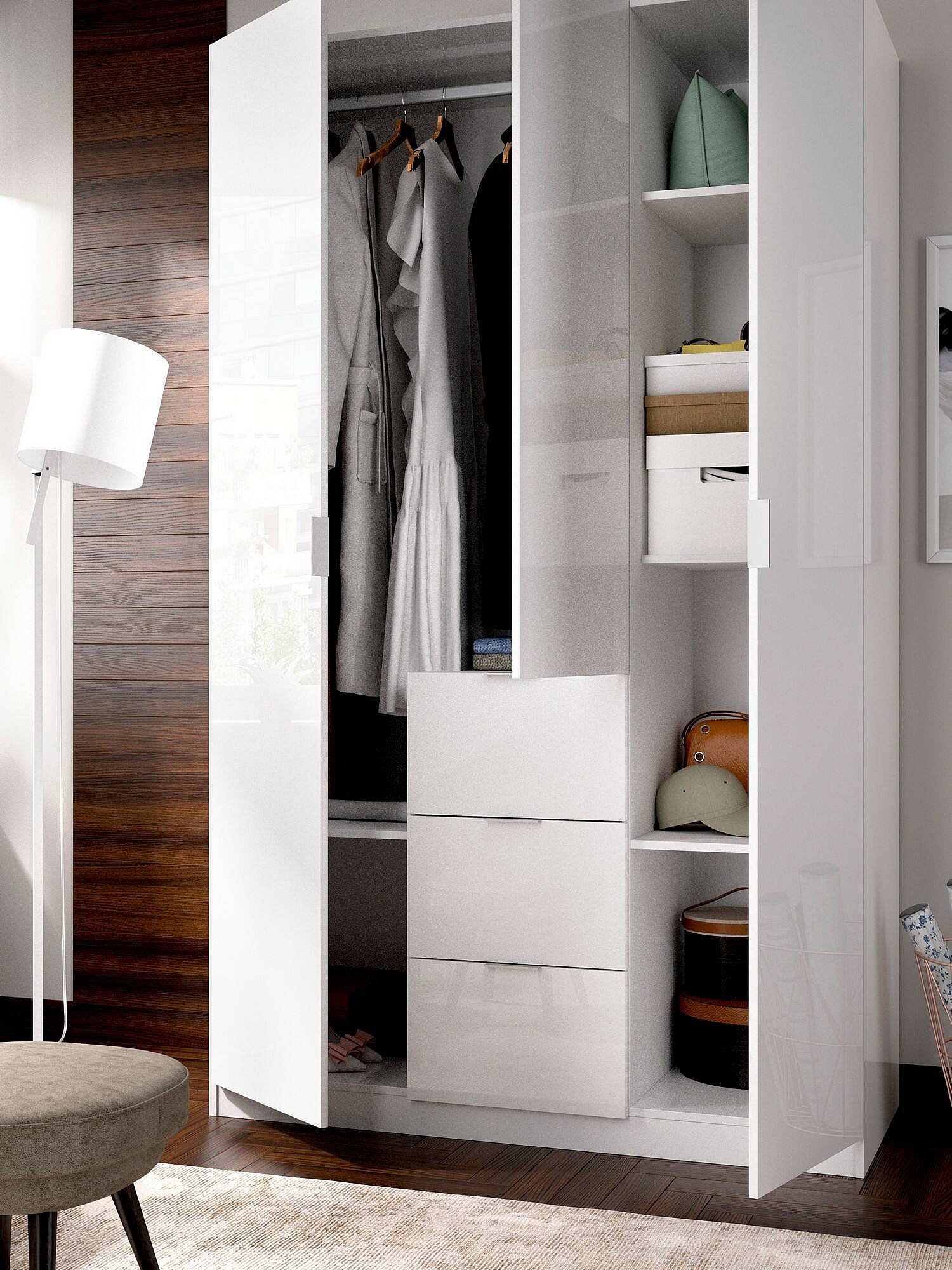 Dcurt Armoire, Cintre pour chambre à coucher, Armoire avec 3 portes battantes et 3 tiroirs, 135x52h204 cm, Blanc