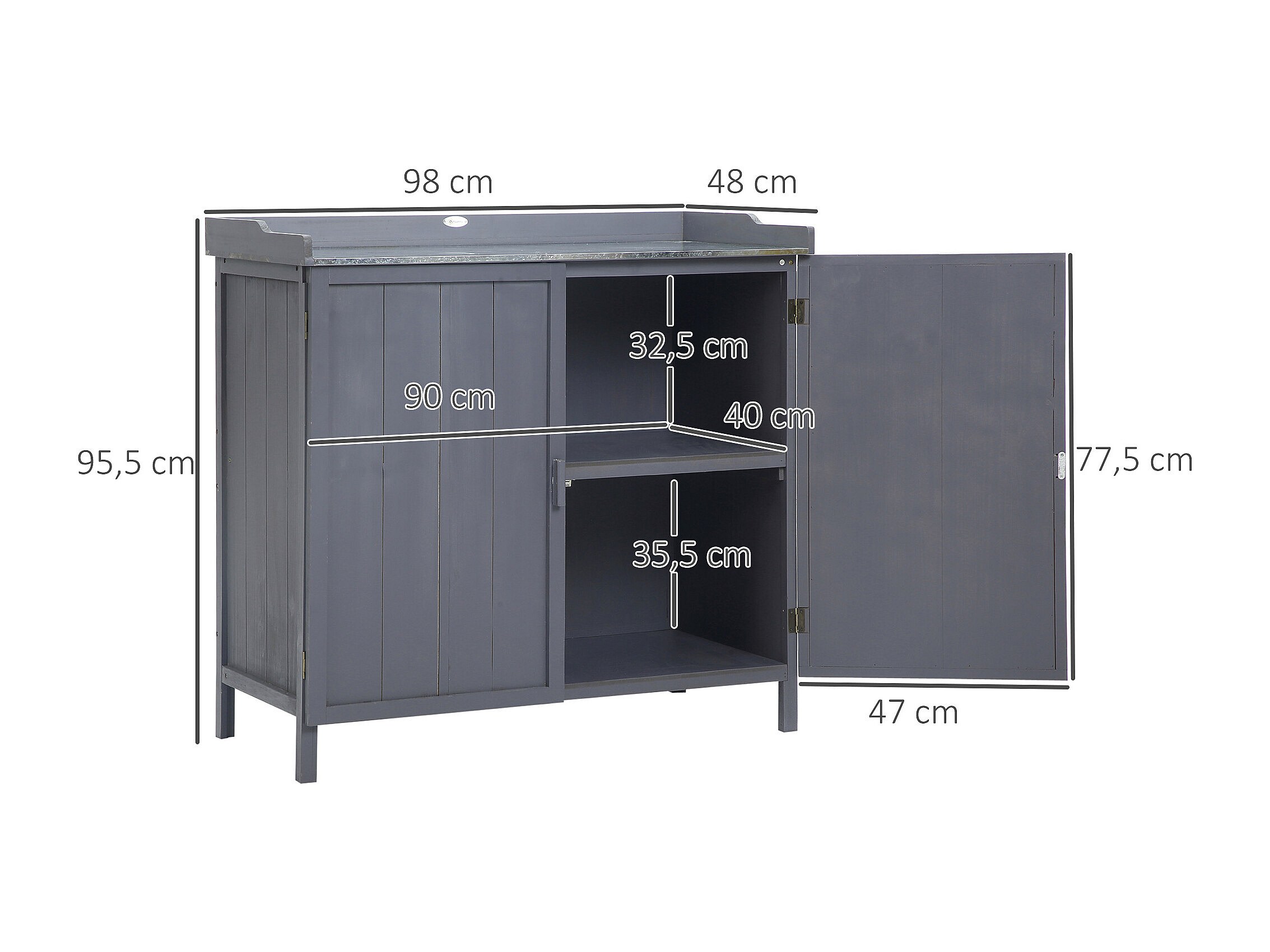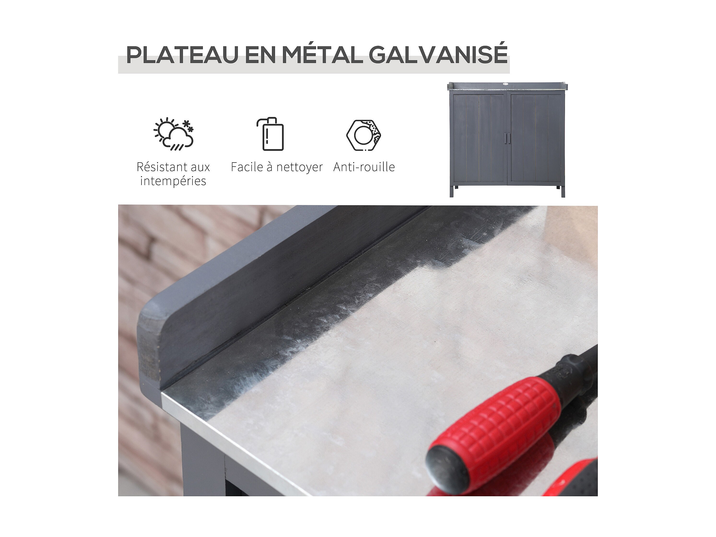 Armoire de rangement de jardin sur pied, table de rempotage 2 en 1 double porte, étagère, plateau métal galvanisé - bois sapin gris