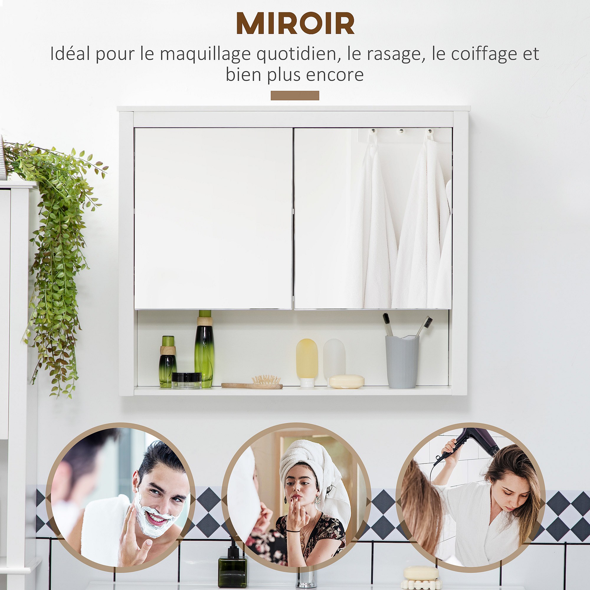 Armoire miroir murale de salle de bain 3 étagères réglables dim. 70L x 60H cm blanc