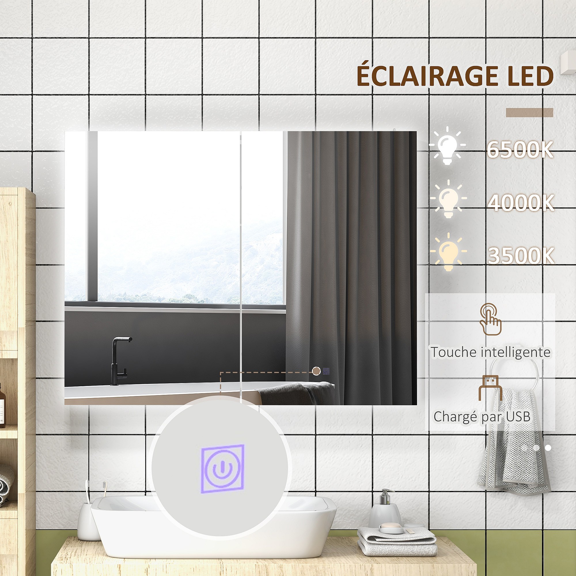 Armoire miroir murale de salle de bain 3 étagères réglables dim. 70L x 60H cm blanc
