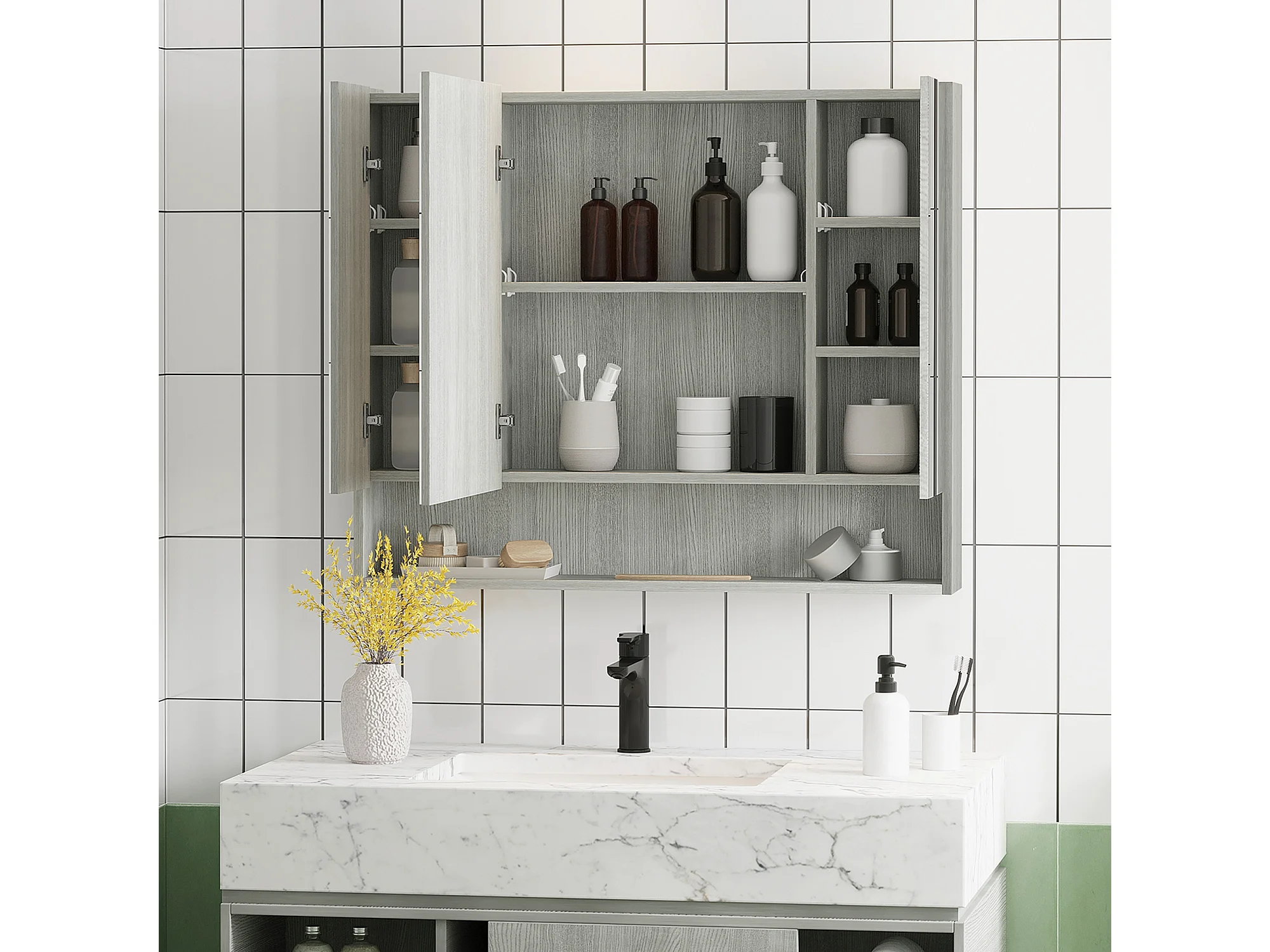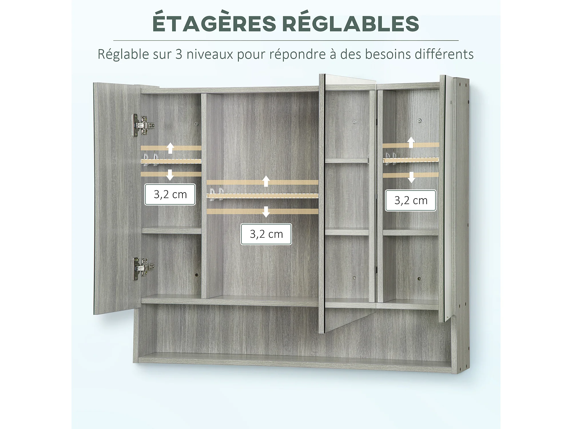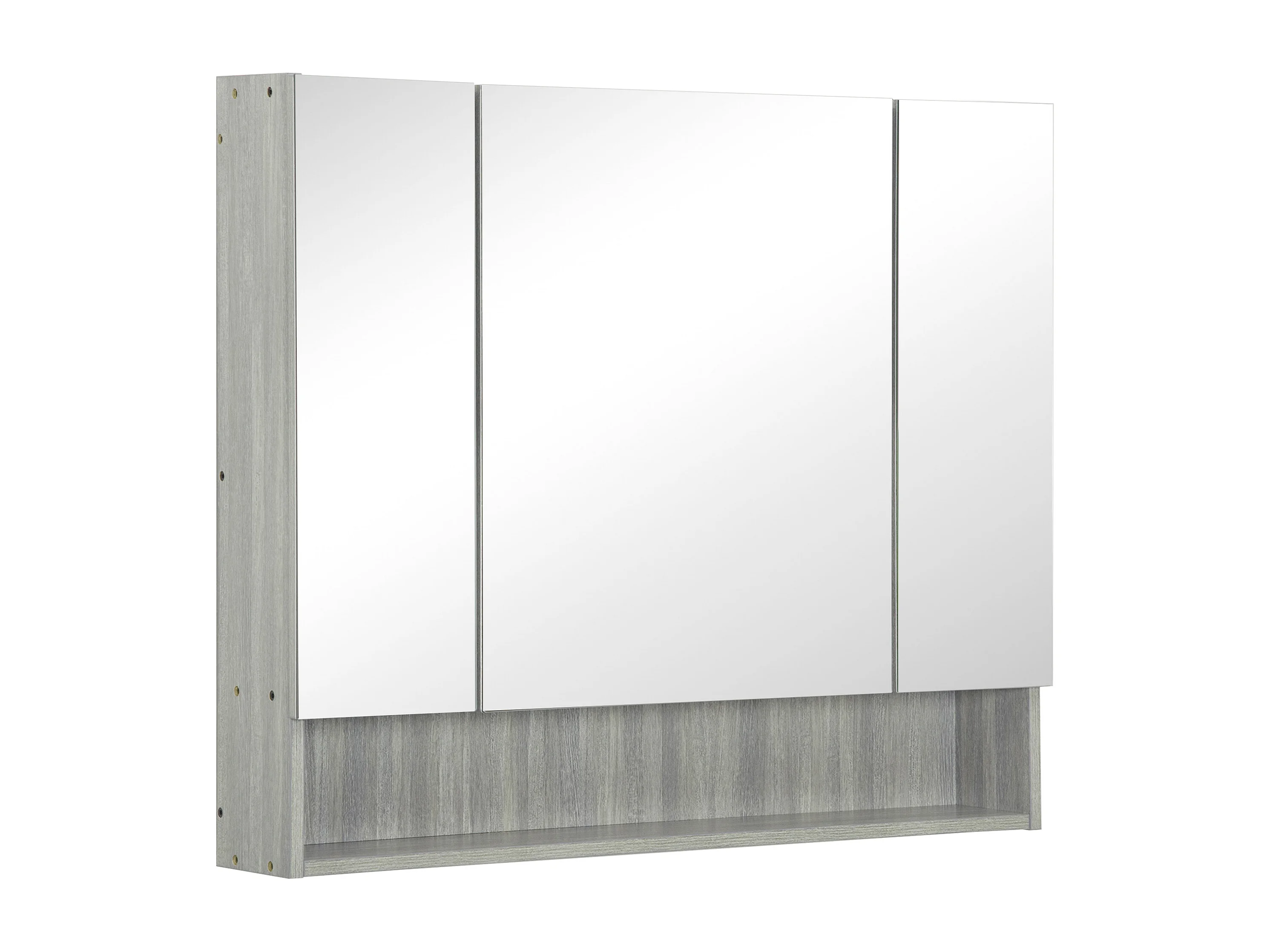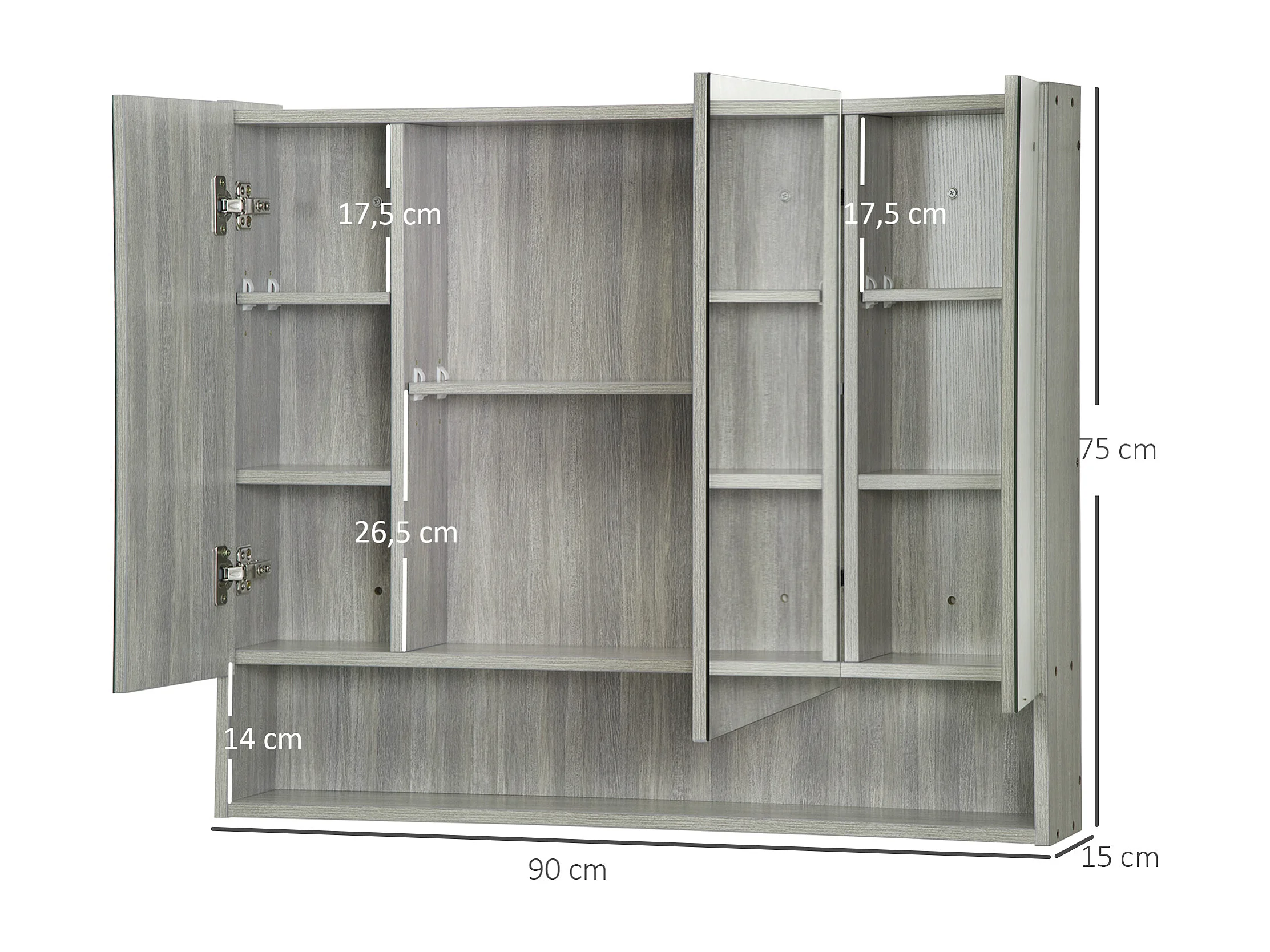 Armoire miroir salle de bain 3 portes 5 étagères, niche - 90 x 15 x 75 cm - effet bois gris