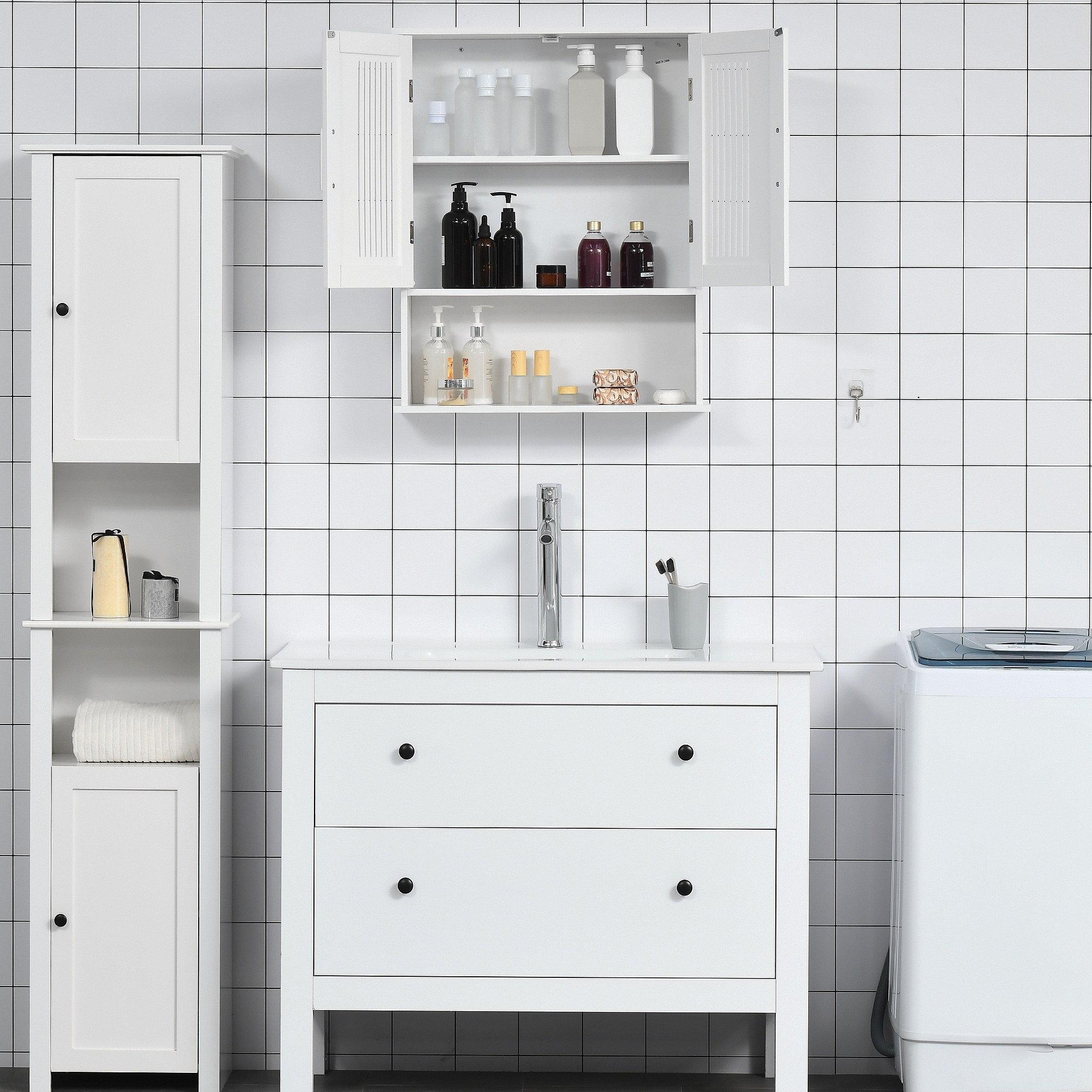 Armoire de salle de bain suspendue 60 cm au-dessus de l'évier avec étagères pour machine à laver blanc chromé