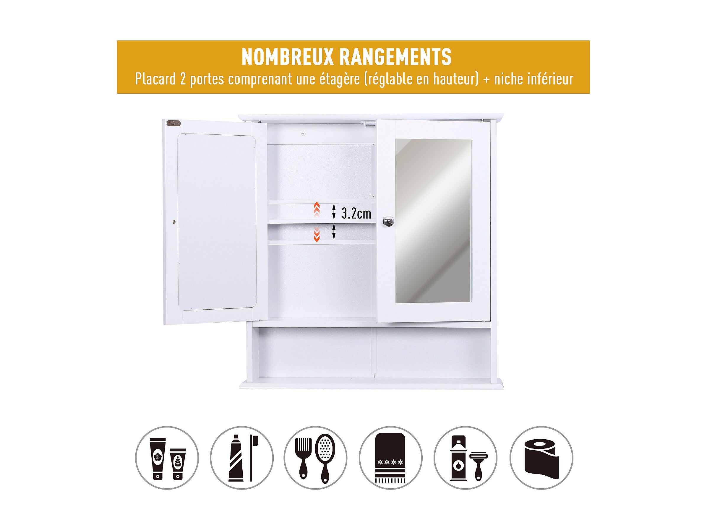 Armoire murale étagère salle de bain 56L x 13l x 58H cm double porte miroir étagère réglable MDF blanc