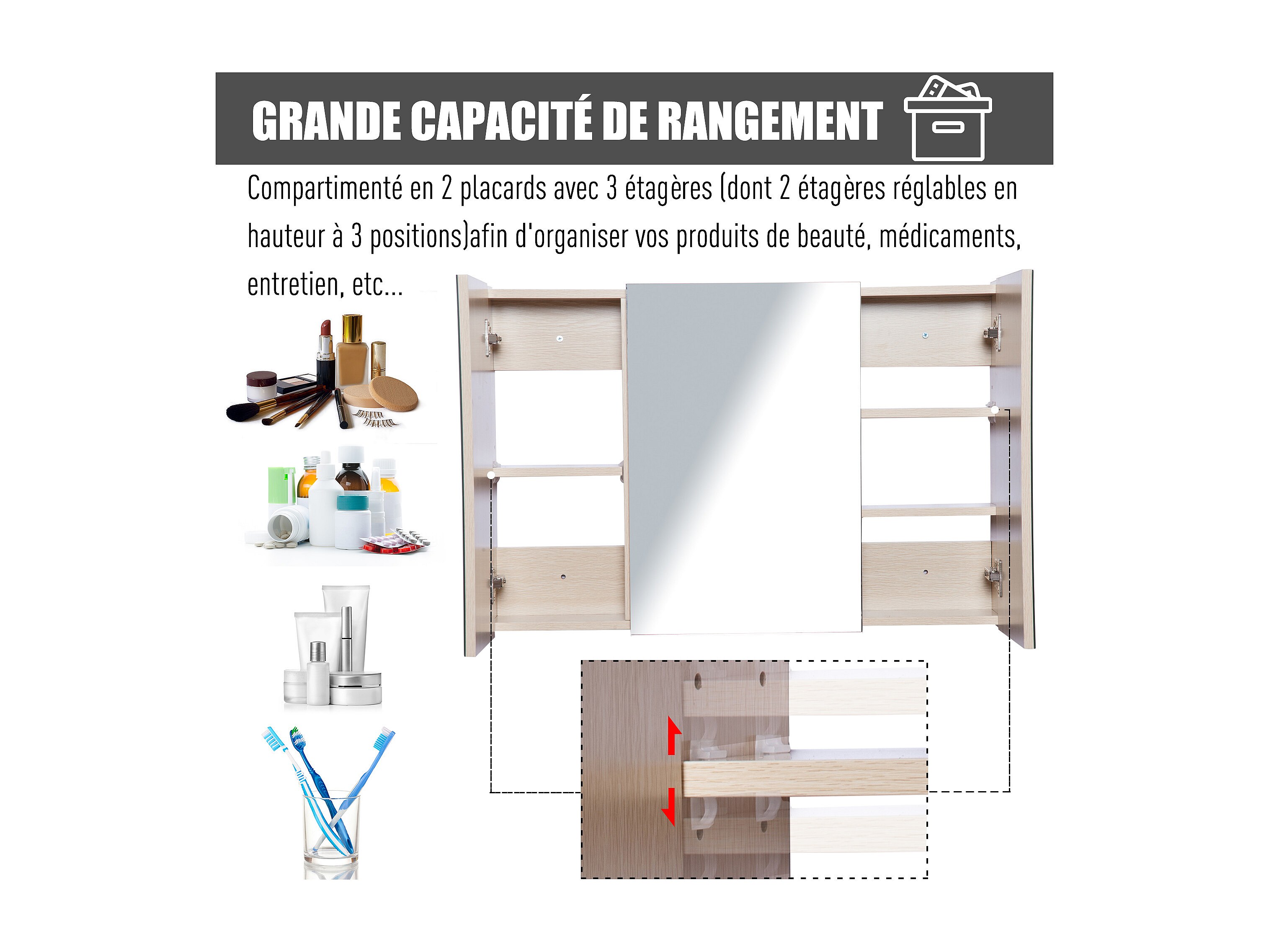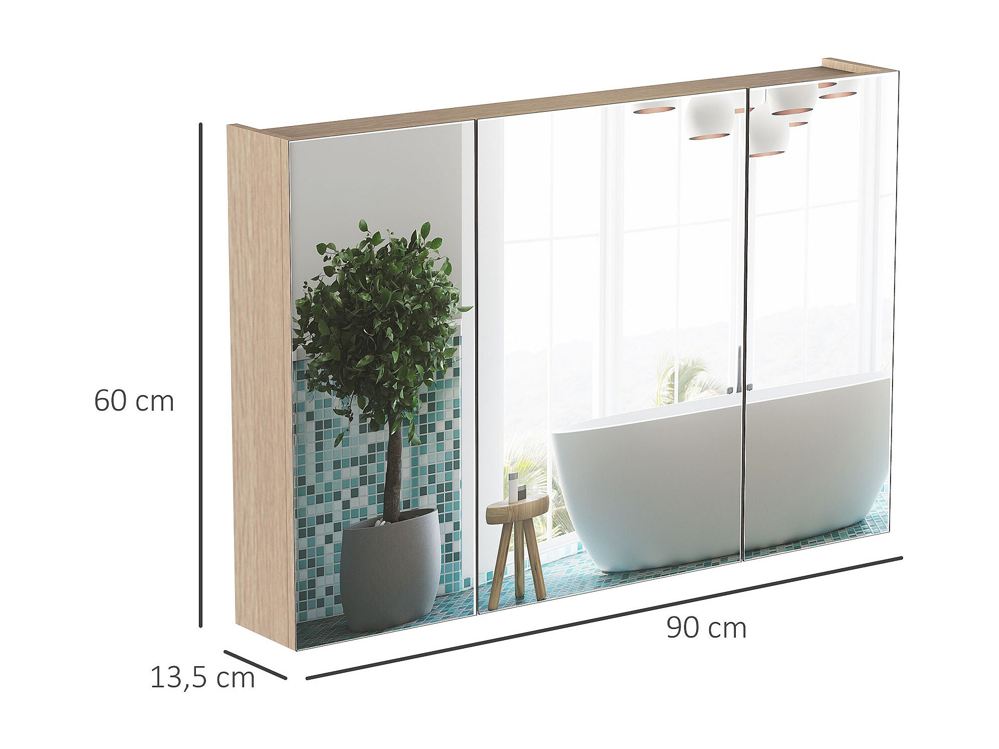 Armoire murale miroir salle de bain 3 portes 3 étagères dim. 90L x 14l x 60H cm panneaux particules chêne clair