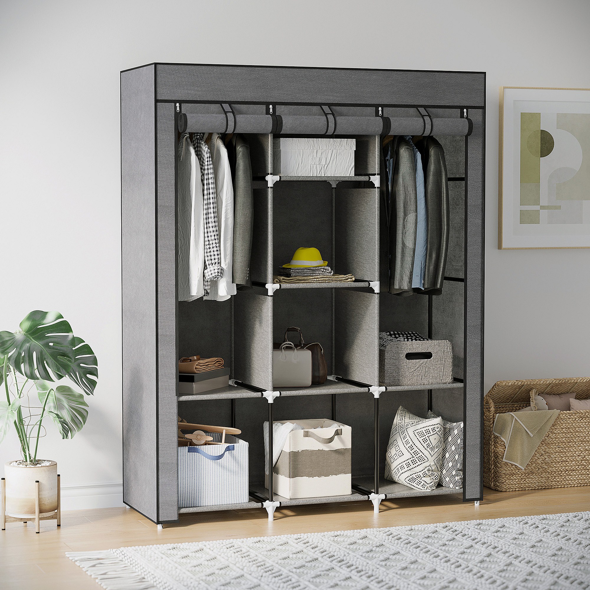 Armoire penderie pliable 5 étagères 2 tringles 3 tiroirs tissu gris