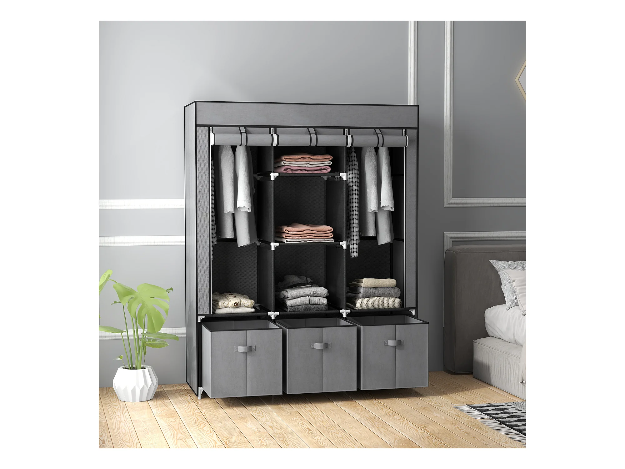 Armoire tissu avec penderie, 10 compartiments, 4 tiroirs, structure acier, gris foncé (166x42.5x169.5cm)