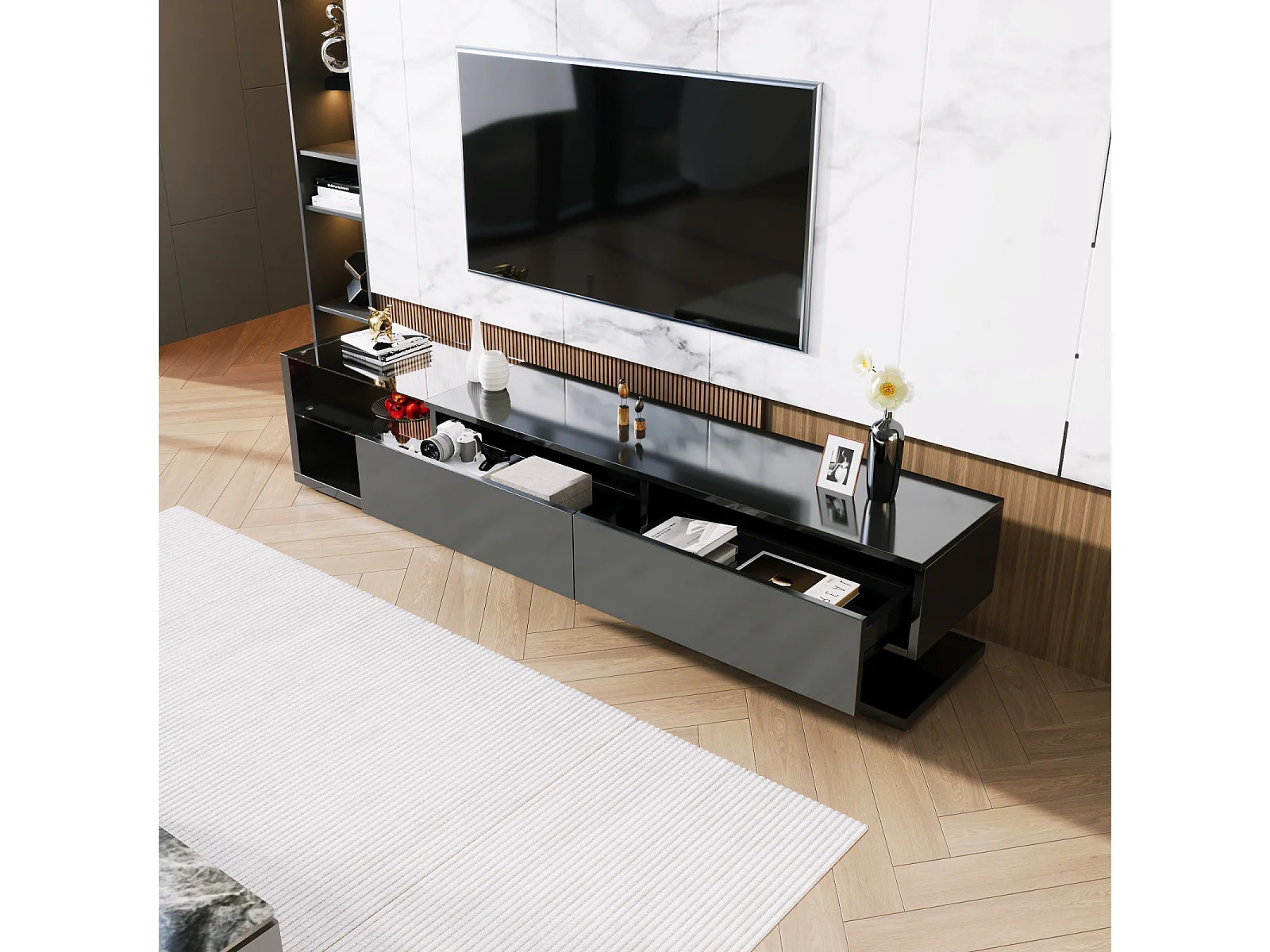Armoire TV Noir avec tiroirs, buffet TV avec LED et étagères en verre, meuble TV pour salon