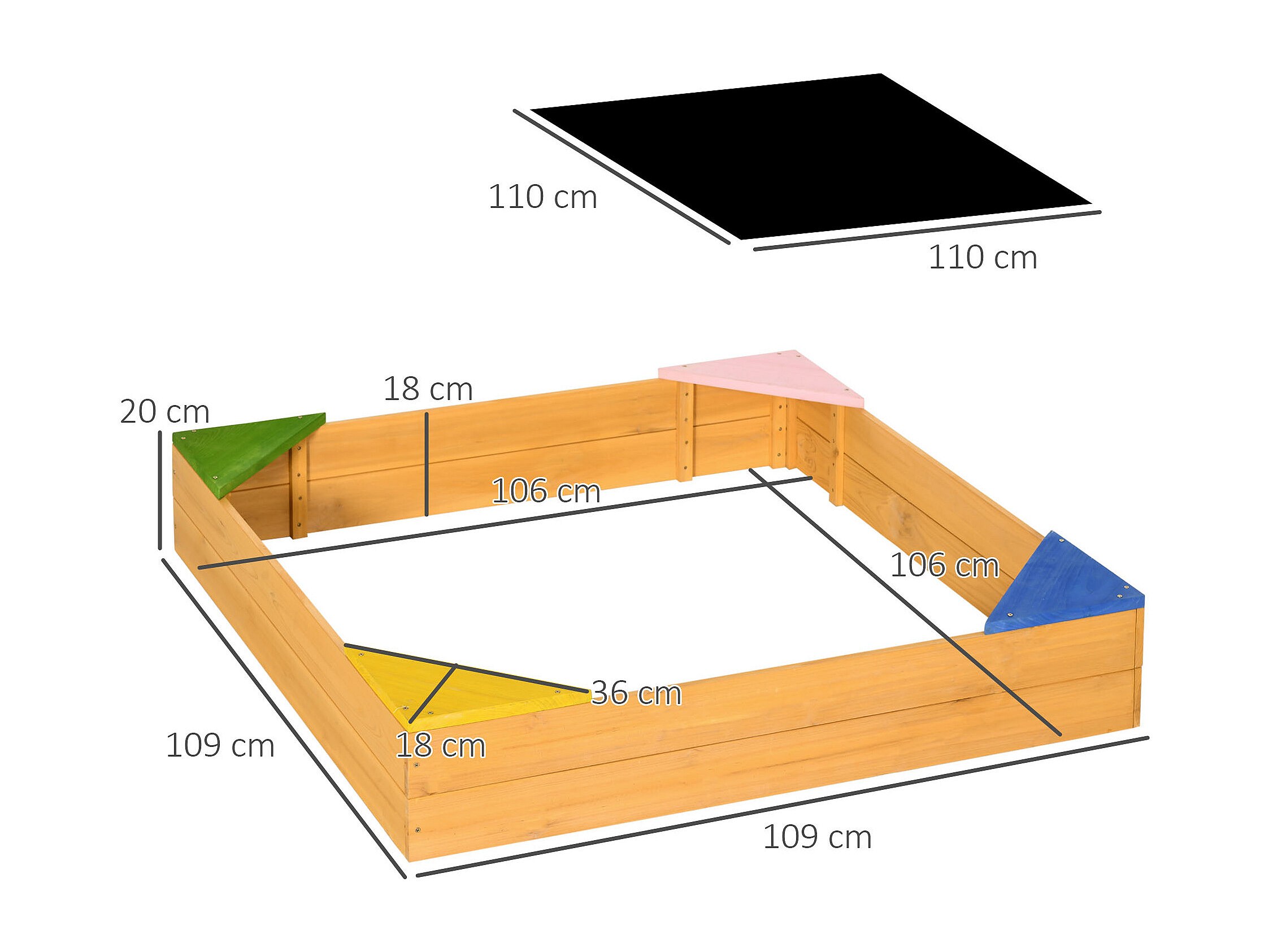 Bac à sable carré en bois pour enfants 4 assises en coin et film protection 109 x 109 x 19,8 cm bois naturel
