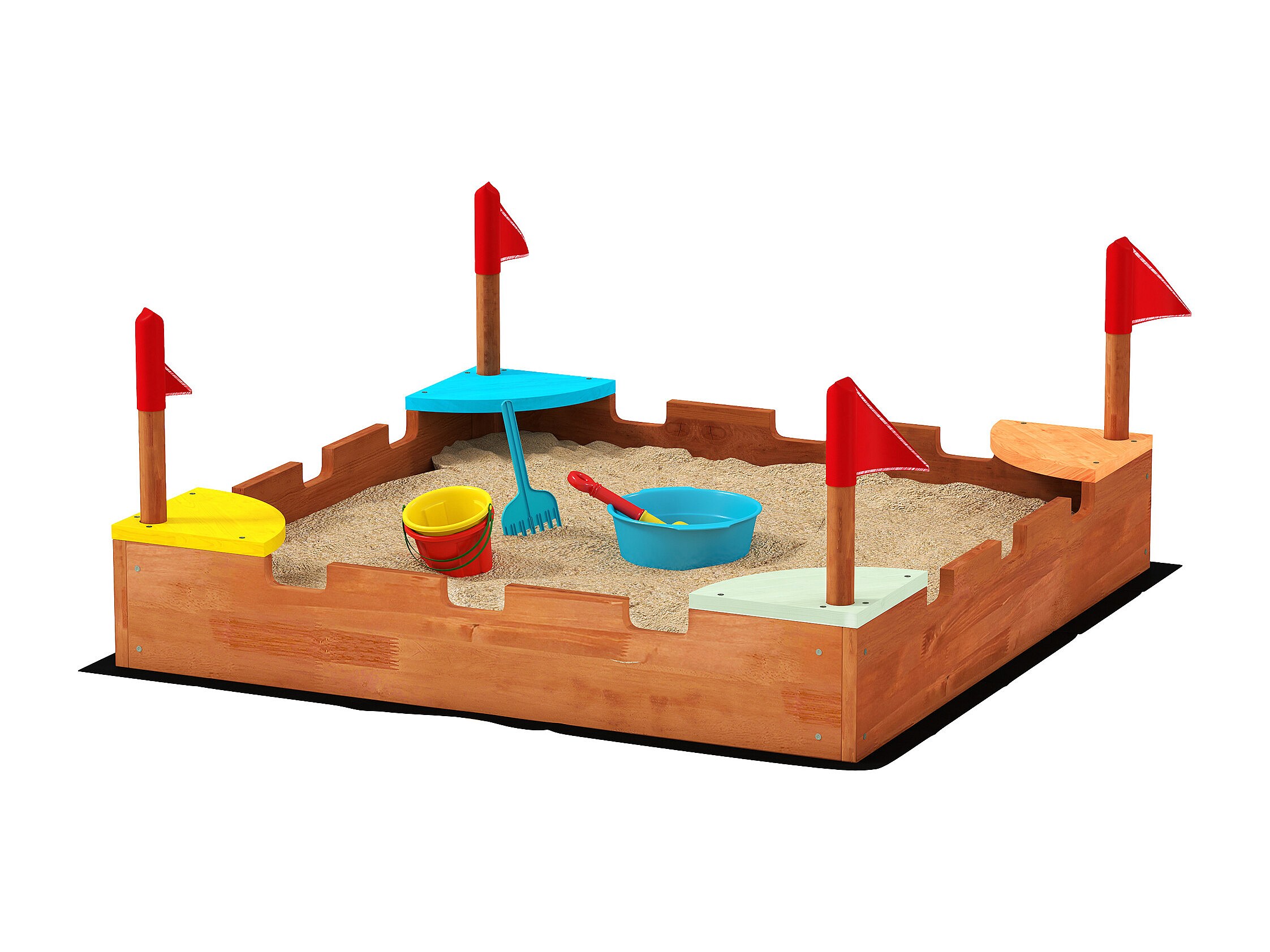 Bac à sable en bois design muraille - 4 drapeaux et sièges, doublure - dim. 90 x 90 x 17 cm - bois sapin pré-huilé