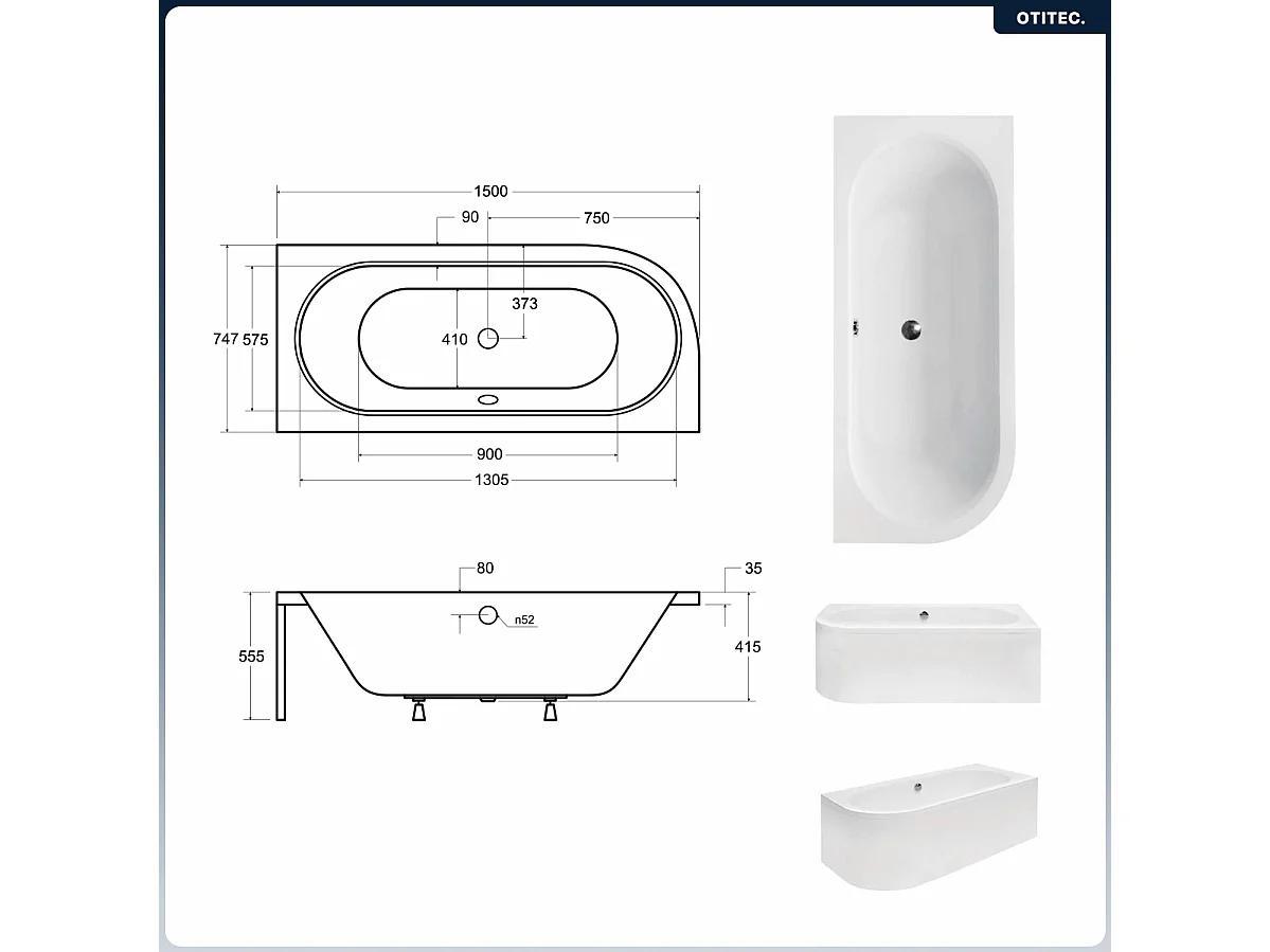 Baignoire asymétrique - 150 x 75 cm - Droite - avec Habillage - Pieds - Vidage Chrome - AVITA