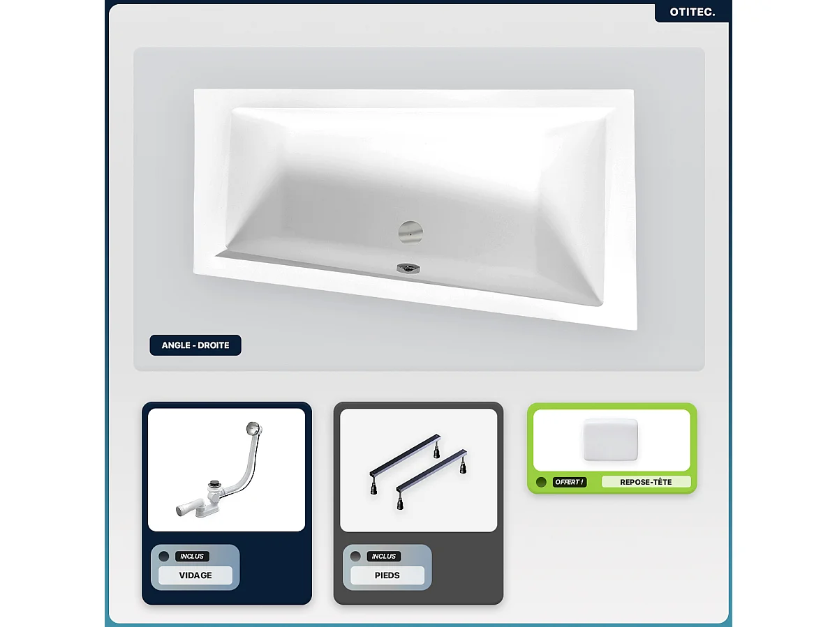 Baignoire asymétrique - 150 x 85 cm - Gauche - sans Habillage - avec Pieds - Repose-tête - Vidage Chrome - INTIMA