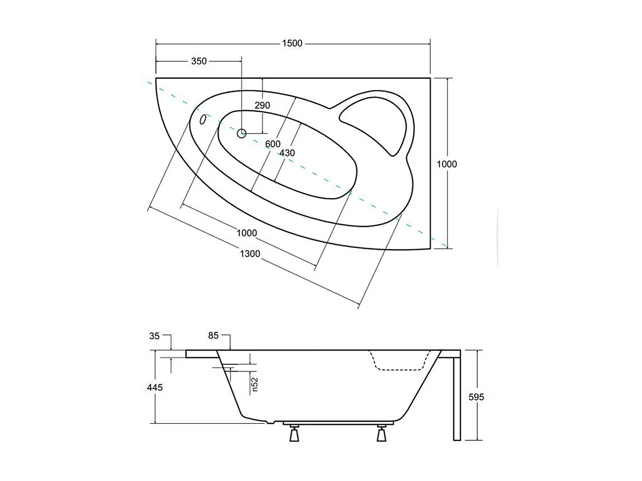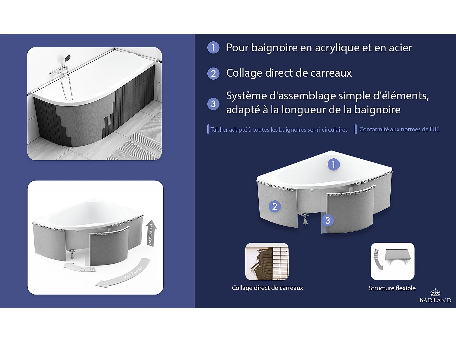 Baignoire asymétrique 150x100 Droite NATALIA acrylique blanc + Habillage en polystyrène + Pieds + Vidage à chromé