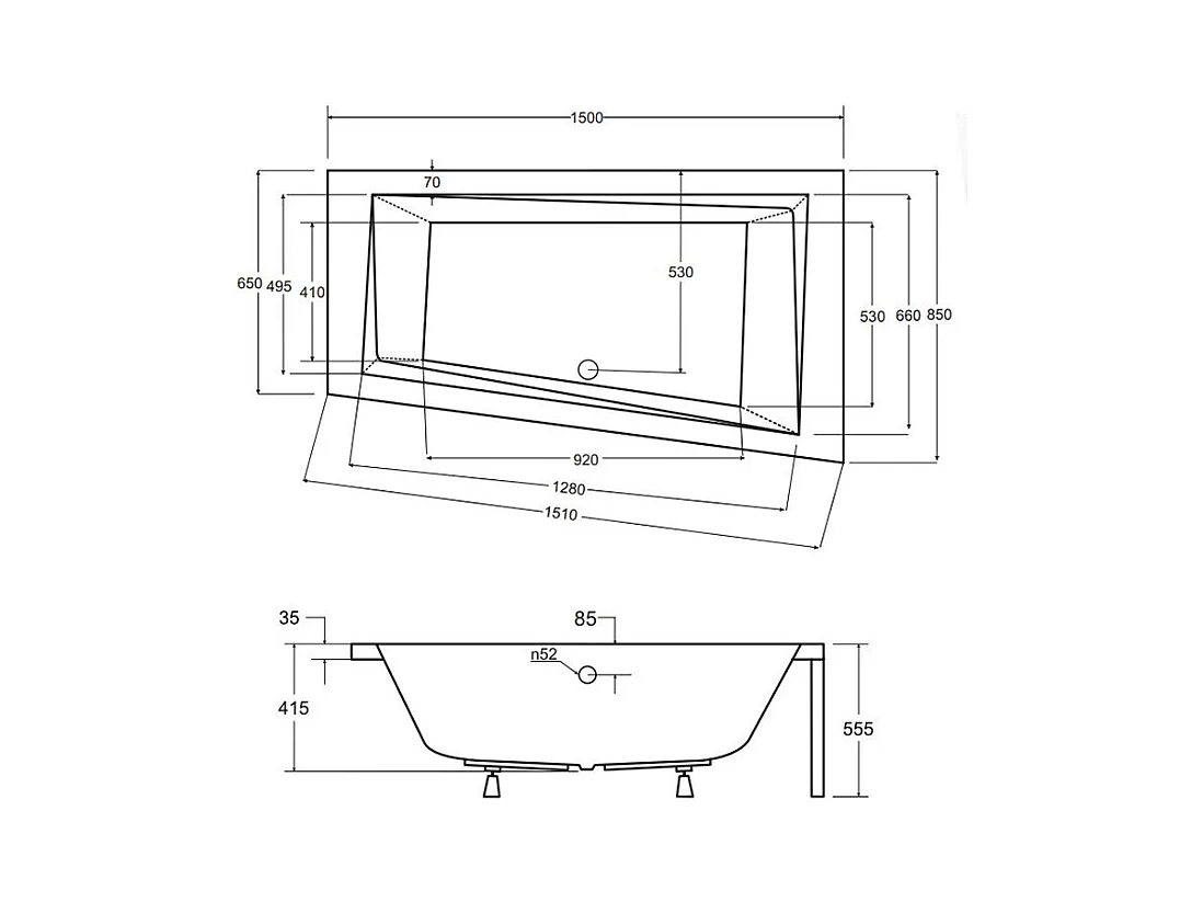 Baignoire asymétrique 150x85 Gauche INTIMA acrylique blanc + avec Tablier + Pieds + Vidage à chromé