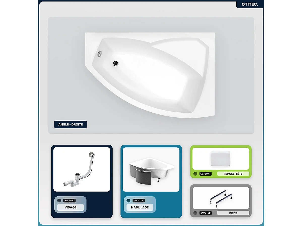 Baignoire asymétrique - 160 x 100 cm - Droite - avec Habillage - Pieds - Repose-tête - Vidage Chrome - RIMA