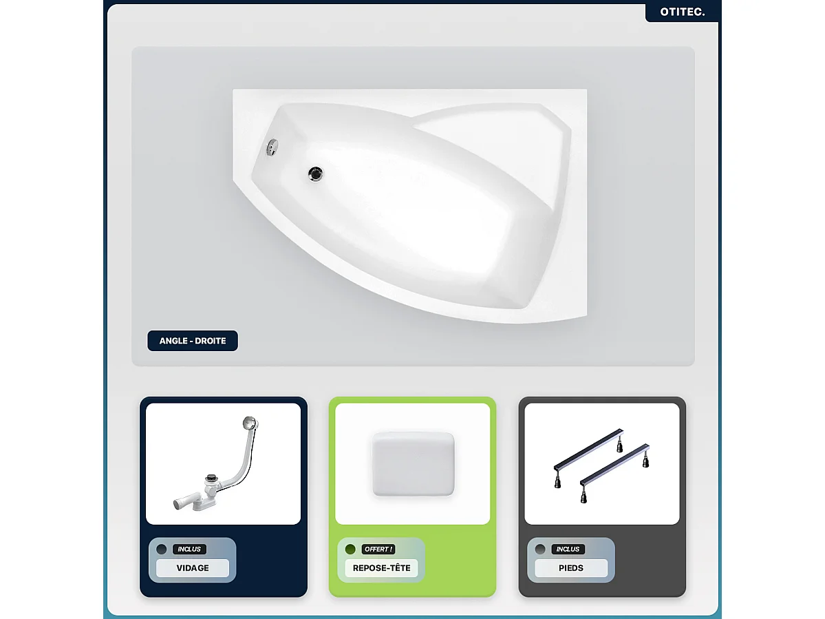 Baignoire asymétrique - 160 x 100 cm - Droite - sans Habillage - avec Pieds - Repose-tête - Vidage Chrome - RIMA