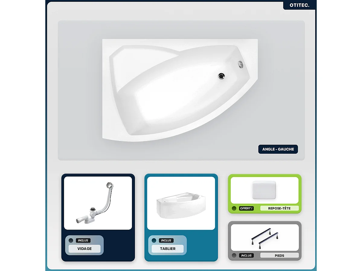 Baignoire asymétrique - 160 x 100 cm - Gauche - avec Tablier - Pieds - Repose-tête - Vidage Chrome - RIMA