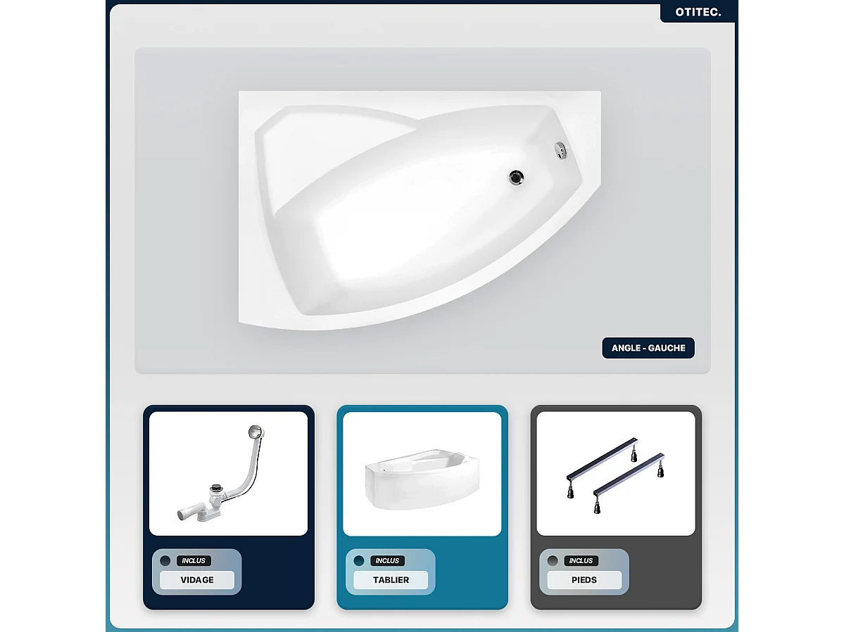 Baignoire asymétrique - 160 x 100 cm - Gauche - avec Tablier - Pieds - Vidage Chrome - RIMA