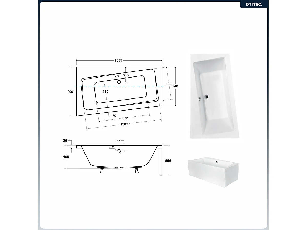 Baignoire asymétrique - 160 x 100 cm - Gauche - sans Habillage - avec Pieds - Vidage Chrome - INFINITY