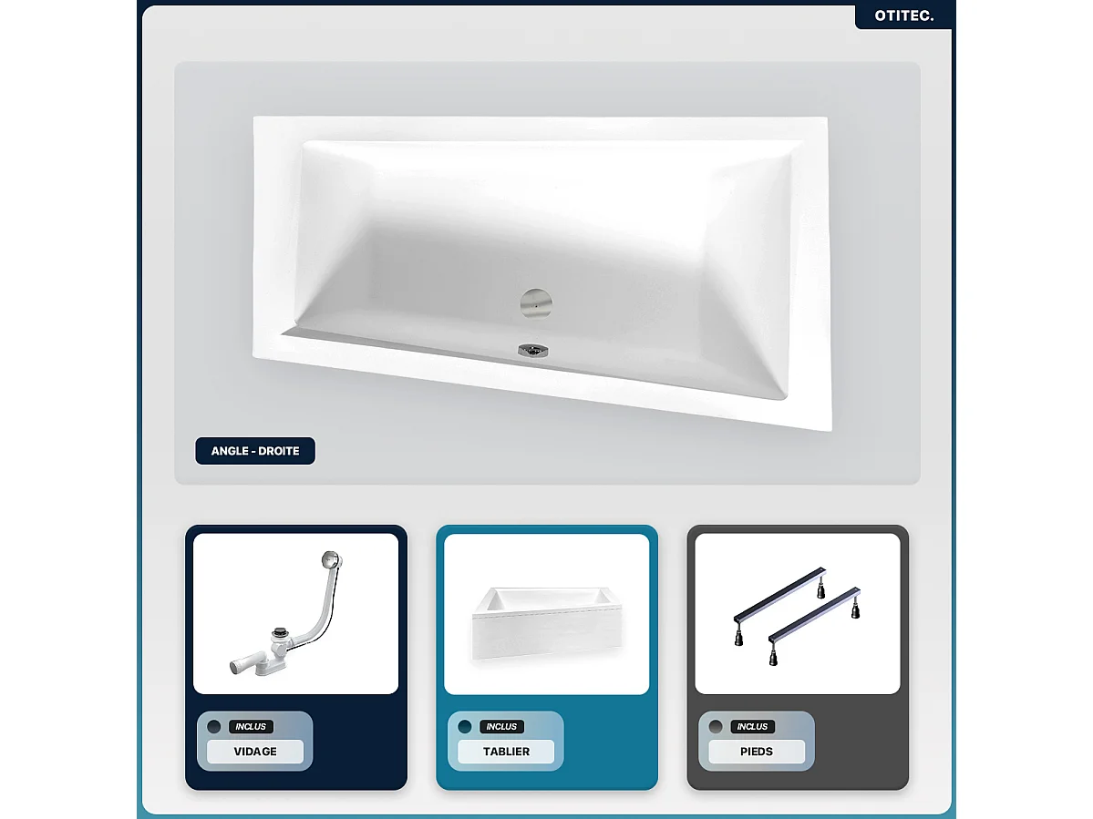 Baignoire asymétrique - 160 x 90 cm - Droite - avec Tablier - Pieds - Vidage Chrome - INTIMA