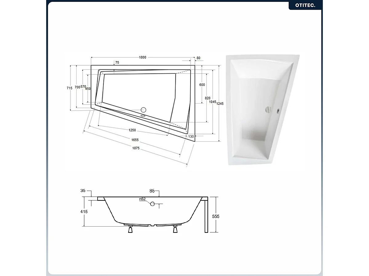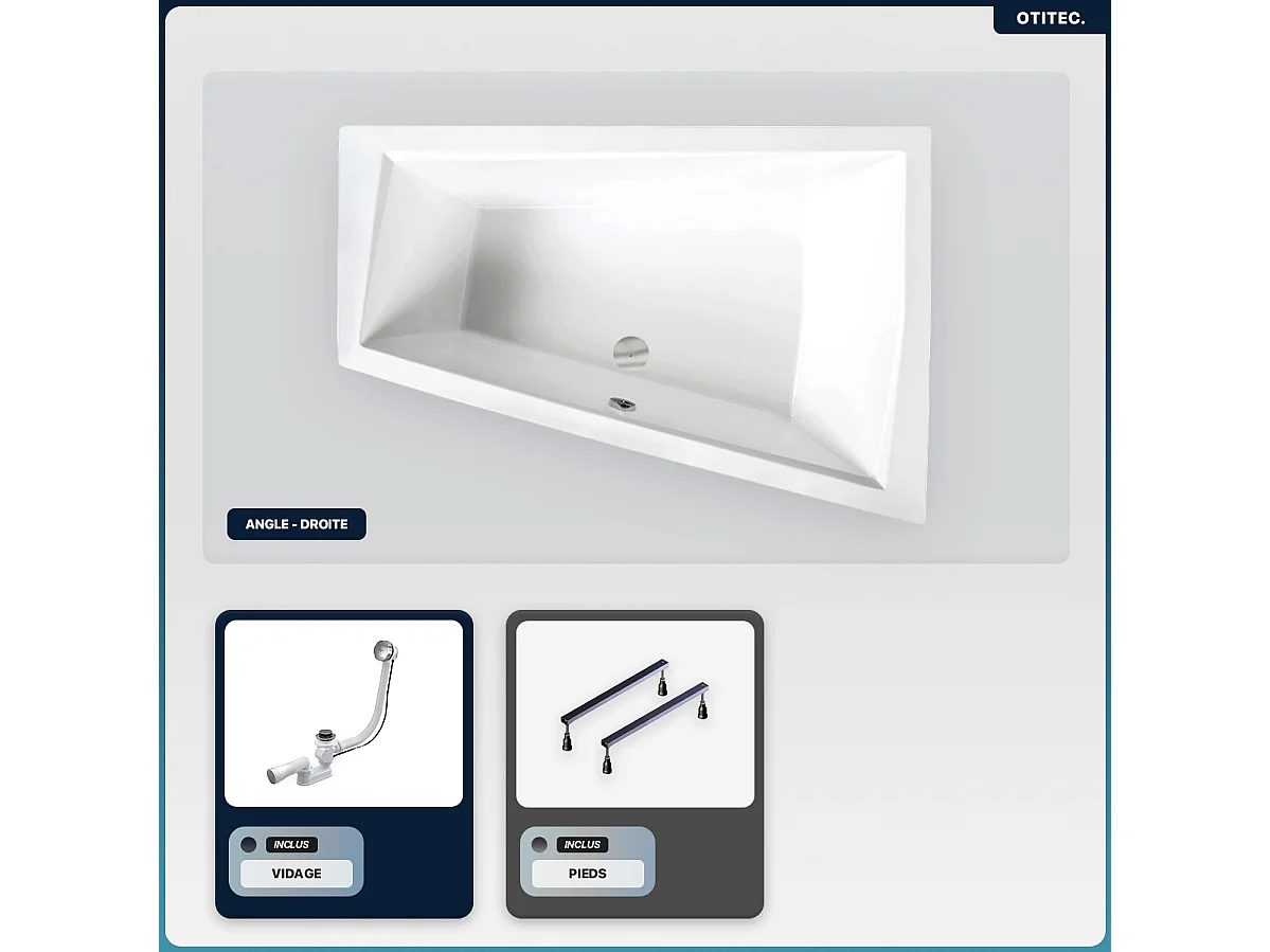 Baignoire asymétrique - 180 x 125 cm - Droite - sans Habillage - avec Pieds - Vidage Chrome - INTIMA DUO