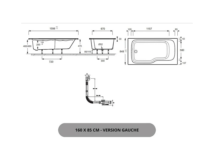 Baignoire bain douche JACOB DELAFON Malice, version gauche Blanc brillant 160 x 85
