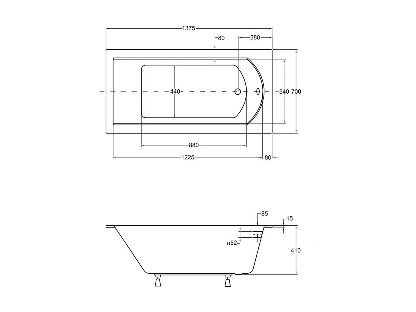 Baignoire rectangulaire 140x70 SHEA SLIM acrylique blanc, sans Habillage + Pieds + Vidage à chromé
