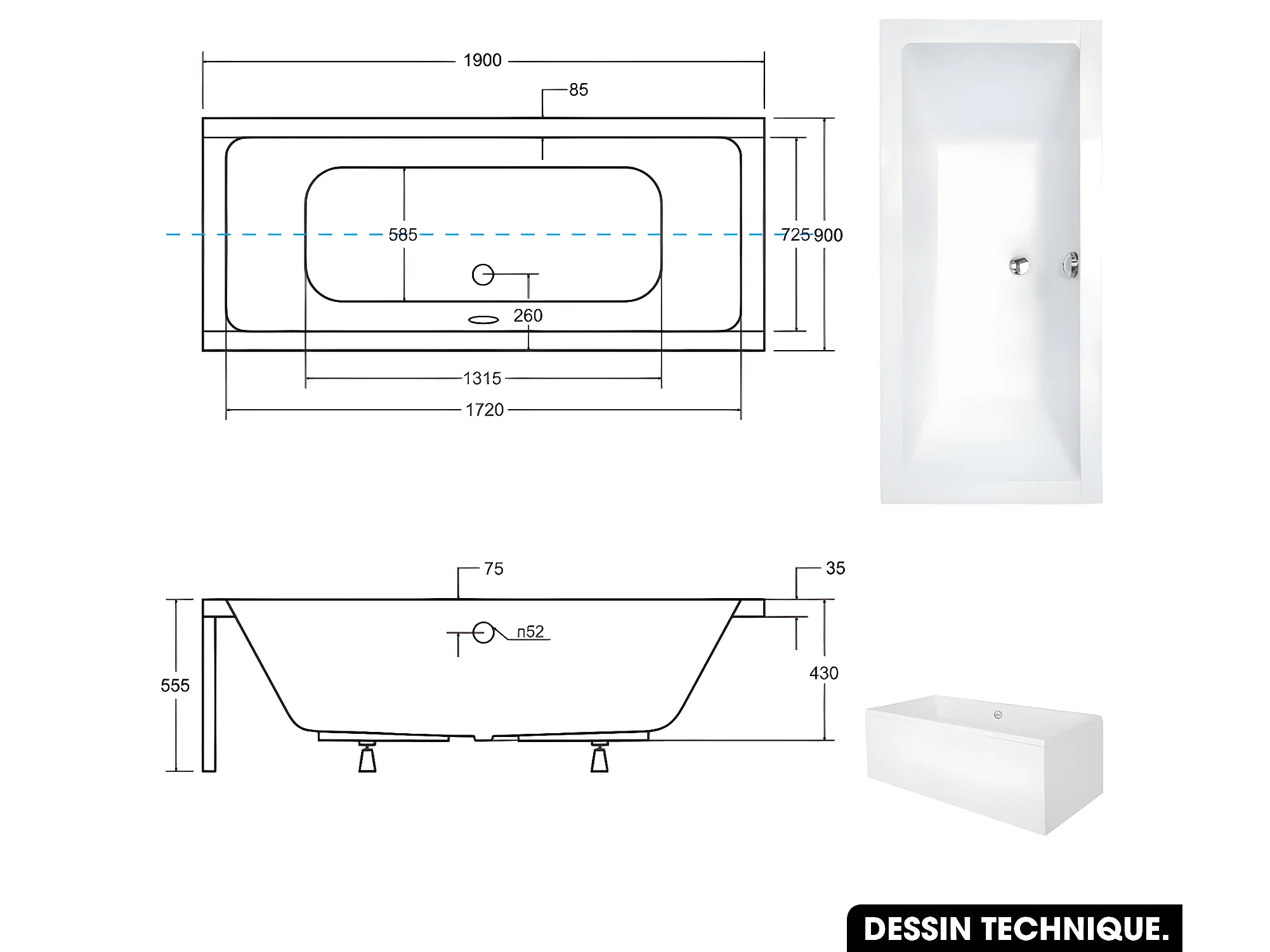 Baignoire rectangulaire - avec Tablier Blanc et Repose Tête OFFERT | QUADRO | 190 x 90 cm