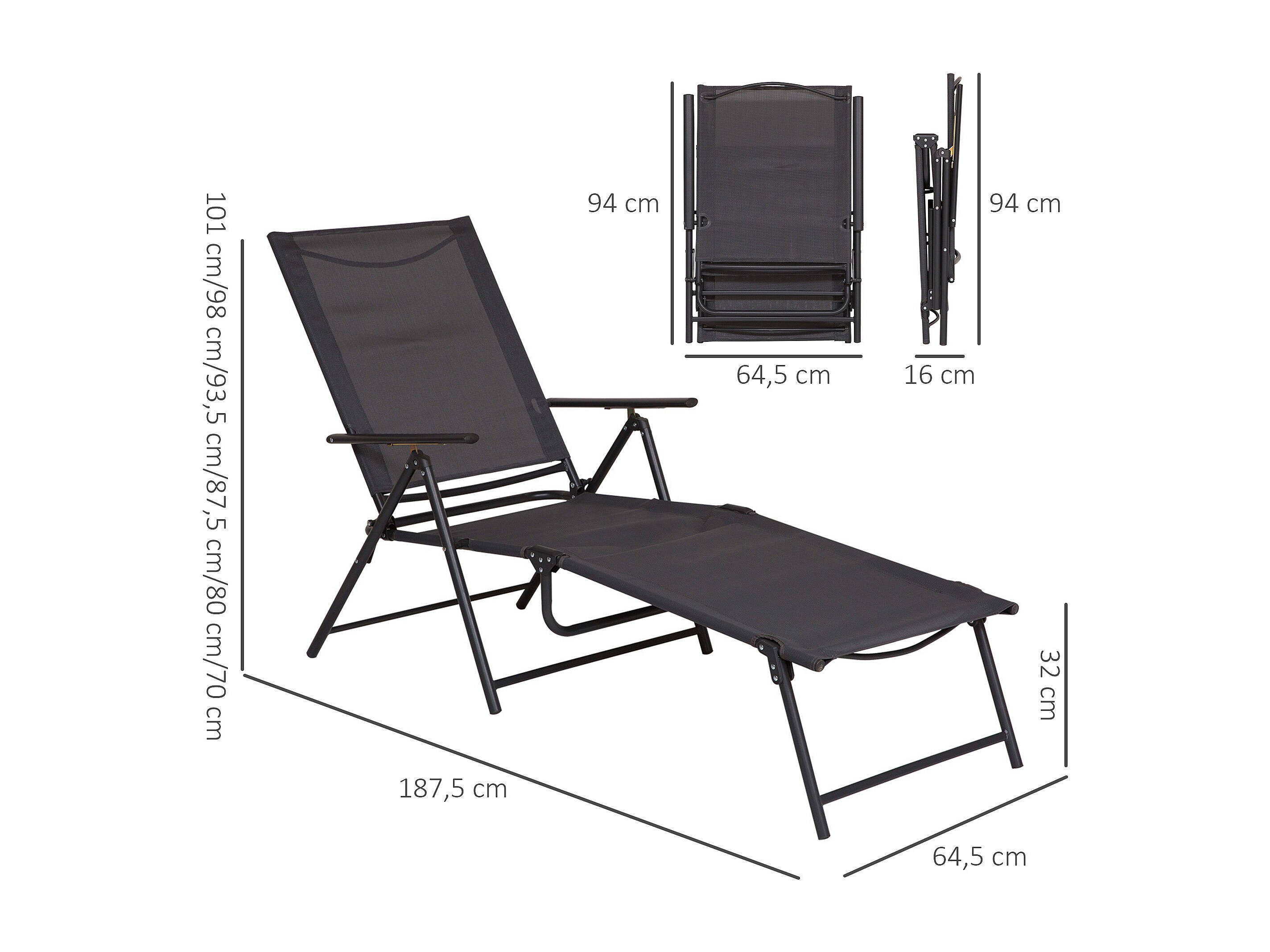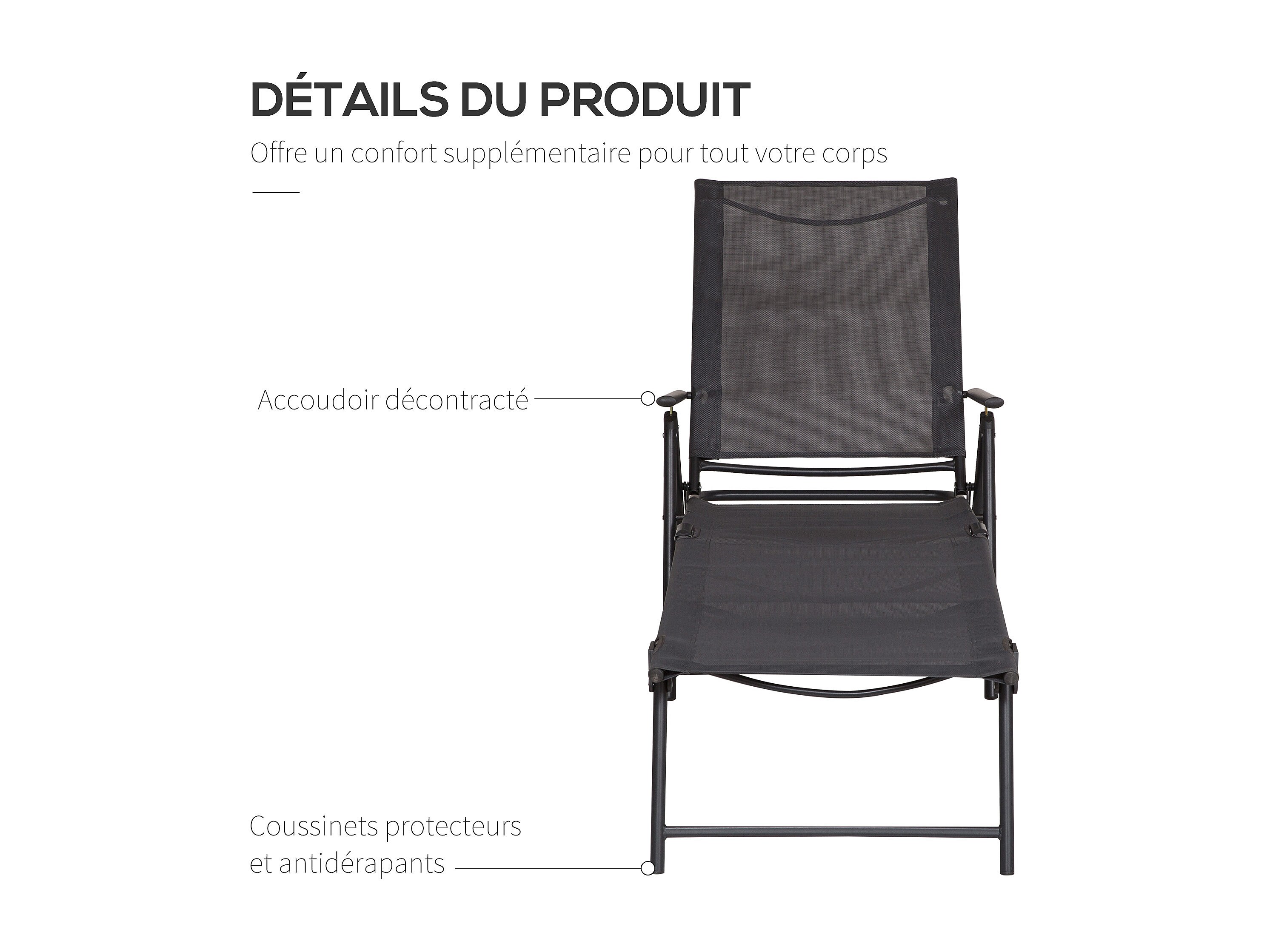 Bain de soleil pliable transat inclinable 5 positions chaise longue grand confort avec accoudoirs dim. 152L x 65l x 100H cm métal époxy textilène gris