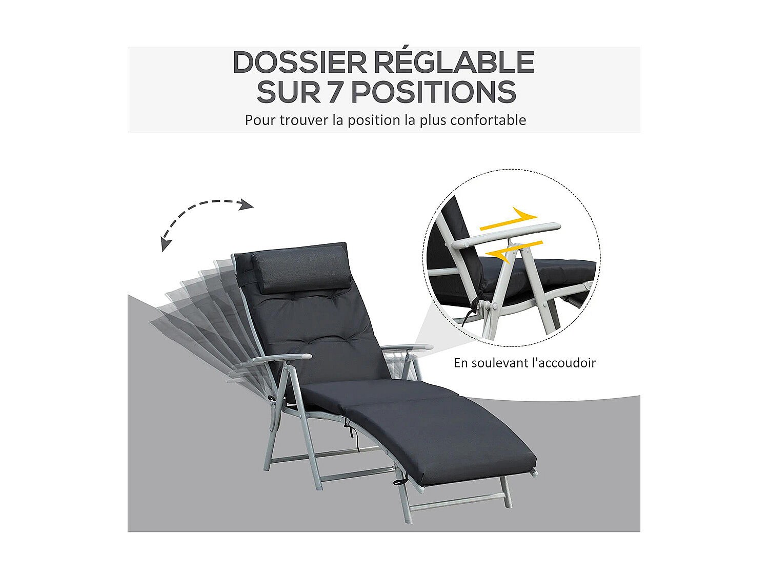 Bain de Soleil pliable transat inclinable 7 Positions Chaise Longue Grand Confort avec Matelas + accoudoirs métal époxy textilène Polyester noir